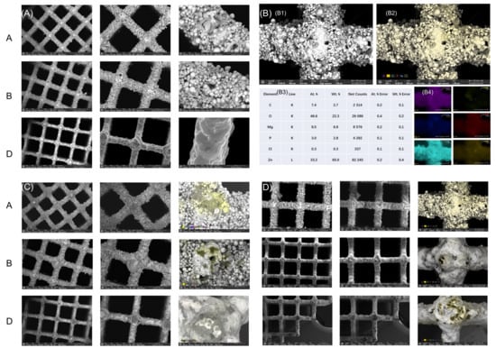 (A) SEM images of Zn-1Mg alloy scaffolds after different surface treatments, demonstrating distinct morphological features. Group A: Surface exhibited pronounced roughness with irregular morphology, dense particle coverage, and visible porosity. Group B: Surface roughness was slightly reduced compared to Group A, but numerous granular protrusions remained, indicating a still relatively coarse texture. Group D: Surface appeared markedly smoother than in Groups A and B, with minimal granular structures and nearly smooth morphology. (B) (B1) The reference scaffold SEM observation. (B2) The reference scaffold SEM-EDX staining. (B3) SEM-EDX elemental analysis and energy-dispersive X-ray spectroscopy. (B4) Analysis of particle elements using EDX spectrometric maps. Yellow area contains carbon, oxygen, magnesium, phosphorus, chlorine, and zinc. SEM/EDX elemental analysis results showed that there was a large amount of organic matter attached to the surface of the scaffold, indicating that a large number of cells were growing. (C) Representative SEM images of chondrocytes with various scaffolds after 14 days of cultivation. Scale bar: 100 µm. (D) Scanning electron microscopy (SEM) images of the porous metal scaffolds revealed the presence of osteoblasts on the surfaces of each scaffold, providing direct evidence of cell adhesion to the scaffold materials. Additionally, energy-dispersive X-ray spectroscopy (EDX) was used to stain the cells yellow, allowing for clear differentiation between the cells and other inorganic materials. The yellow regions in the images confirmed that the observed material was indeed cellular, demonstrating that all Zn-1Mg scaffolds exhibit good biocompatibility.