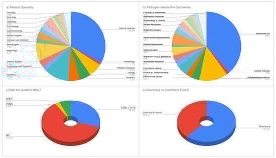 Medical Specialties of the Participants and Pathogens Detected in Bacteremia Episodes. (a) Distribution of medical specialties among 65 participating physicians. (b) Pathogen distribution among 90 bacteremia cases. (c) Antimicrobial resistance patterns including ESBL CTX-M (30.0%), AmpC (6.3%), and non-MDR isolates (61.3%). (d) Percentage of surveys associated with OneChoice vs OneChoice Fusion by participants.