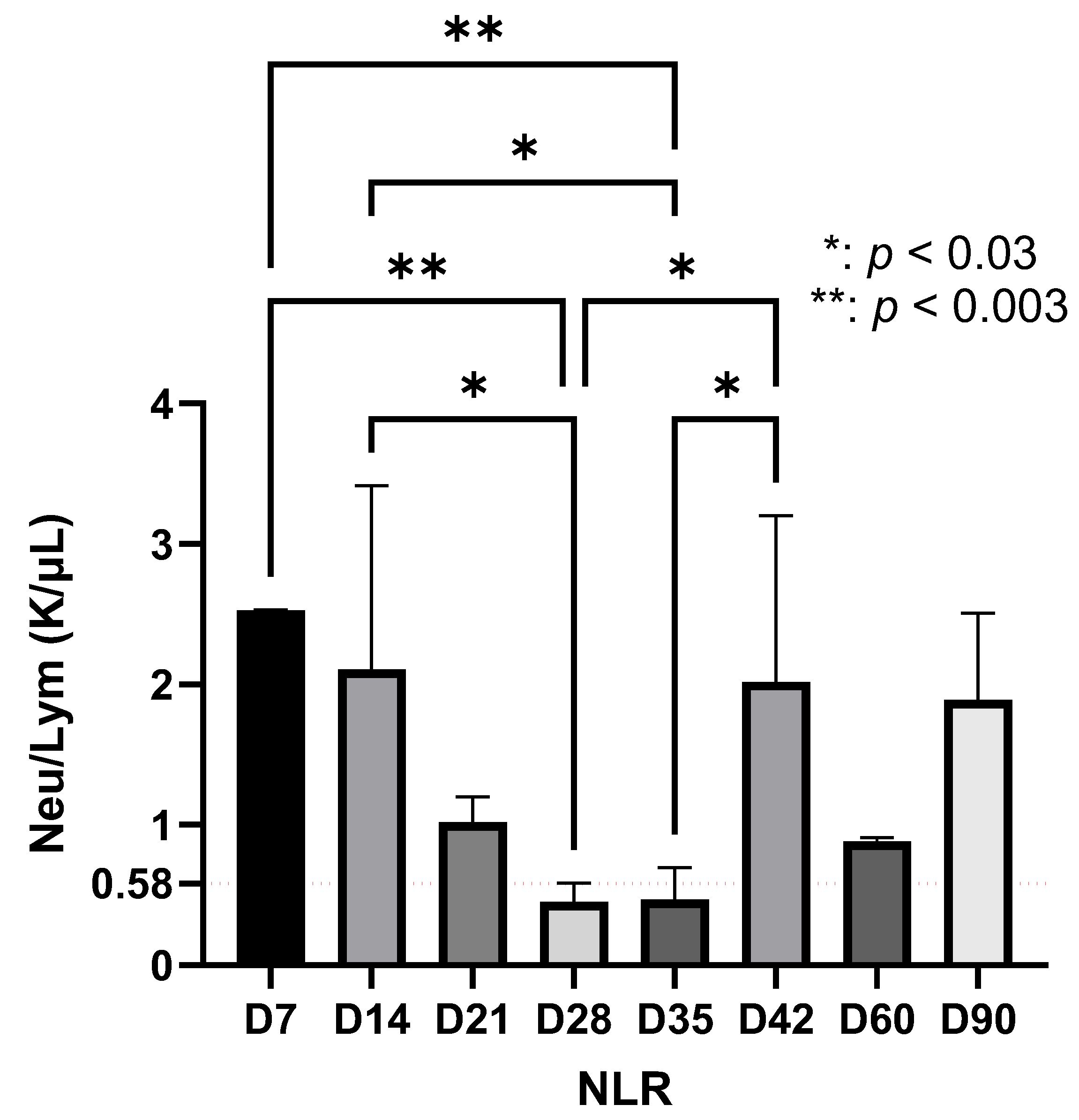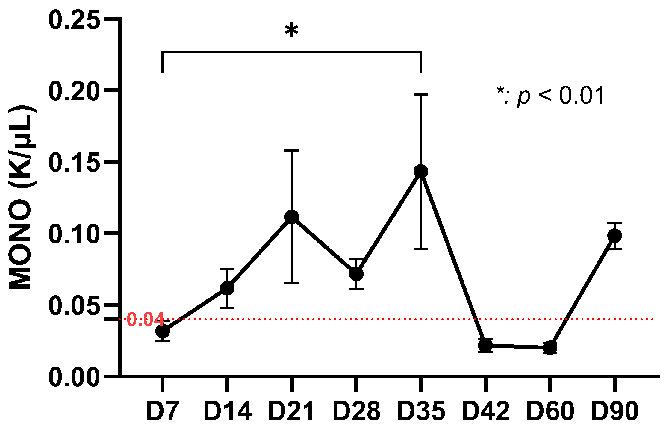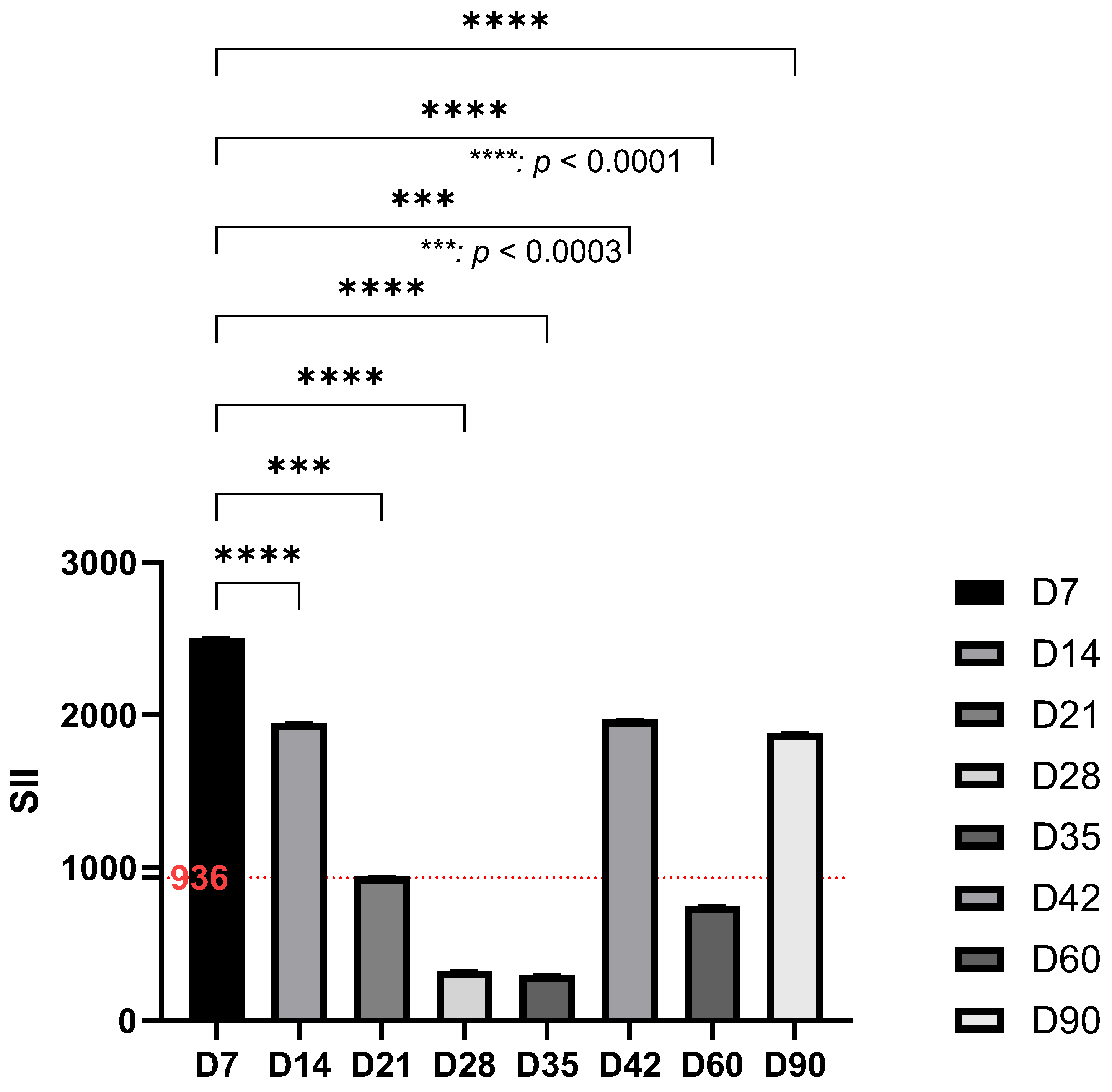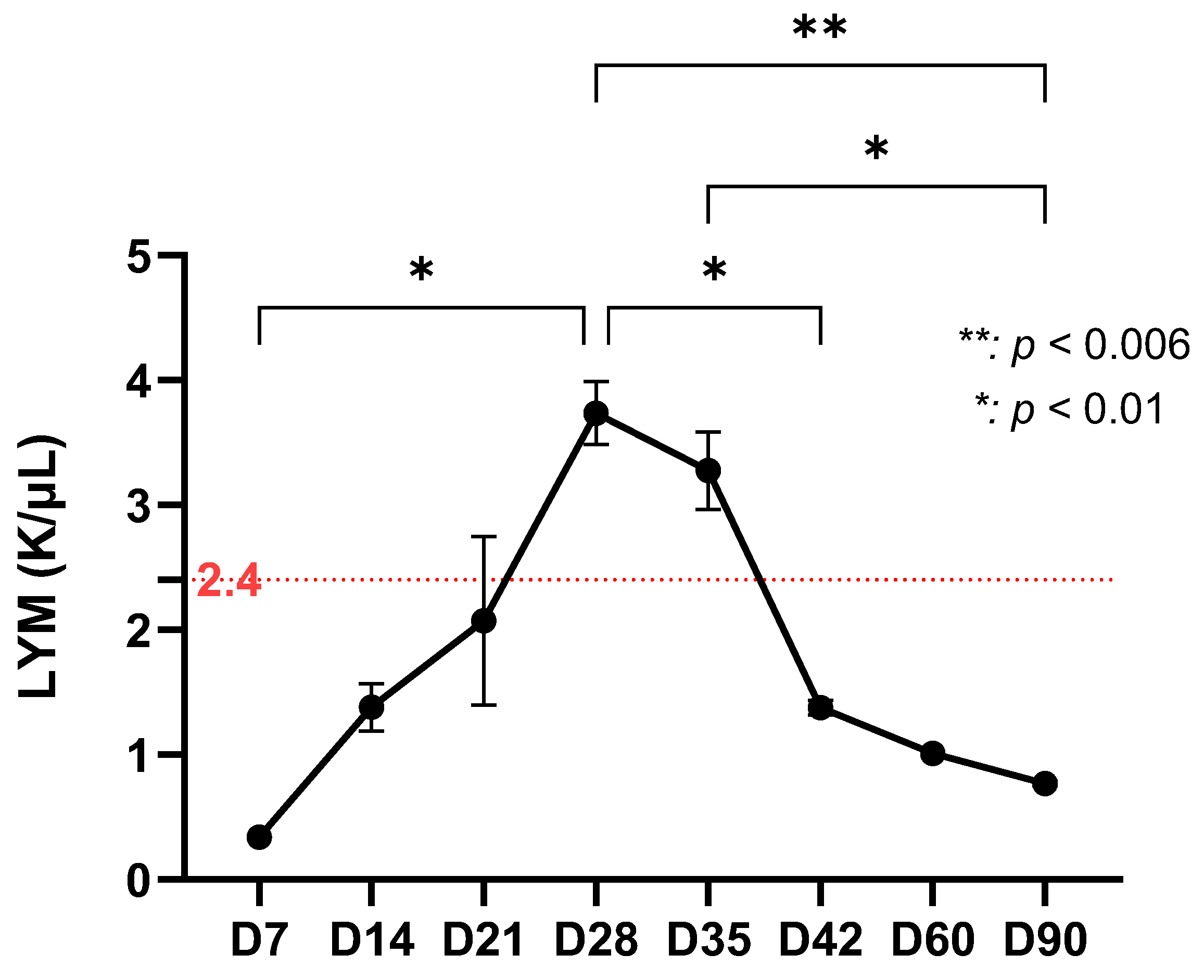 | Significant increase in lymphocytes (p < 0.01) at D28–D35 Increase in monocytes with peak at D35 (p < 0.01) Decrease in systemic immuno-inflammatory index Transition to adaptive immune response | |