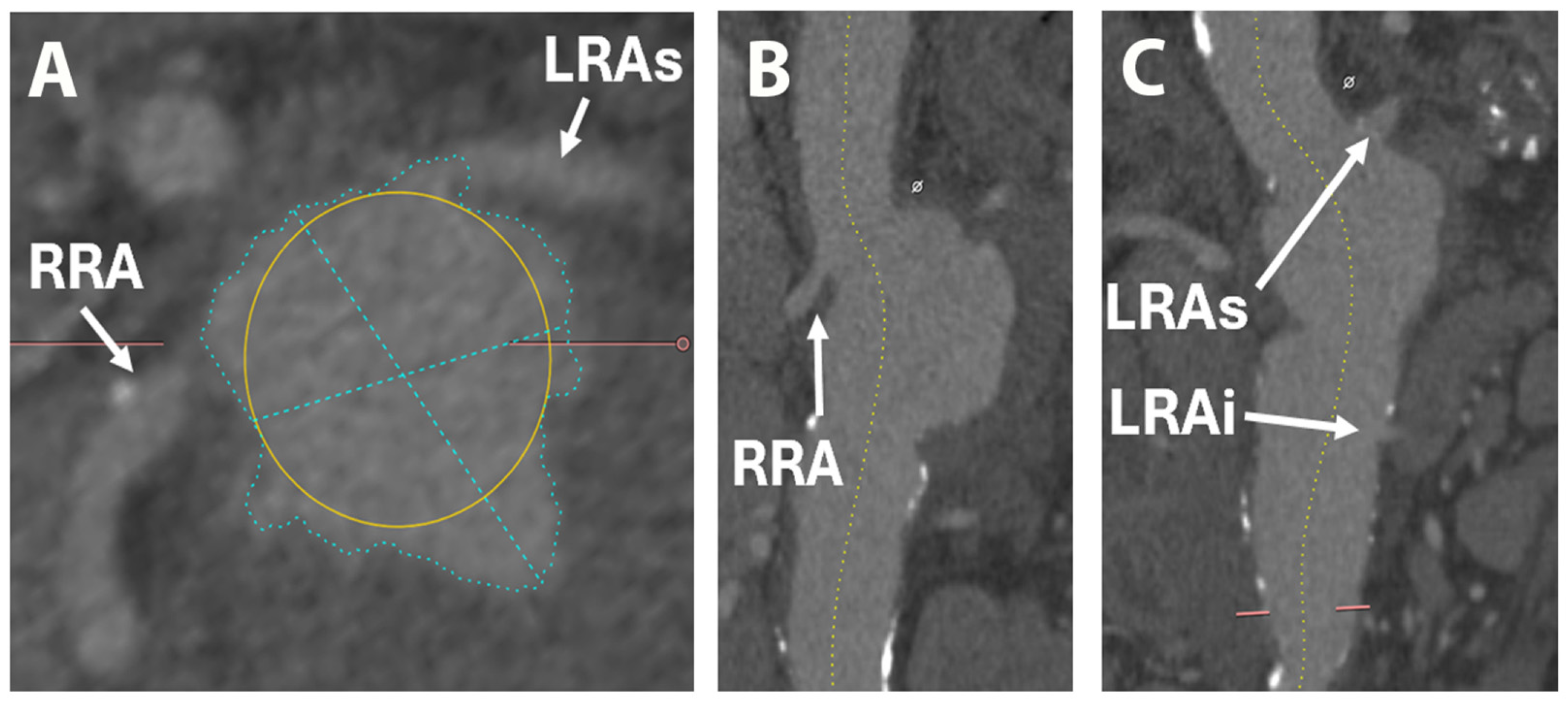 - Oderich, G.S.; Forbes, T.L.; Chaer, R.; Davies, M.G.; Lindsay, T.F.; Mastracci, T.; Singh, M.J.; Timaran, C.; Woo, E.Y. Reporting standards for endovascular aortic repair of aneurysms involving the renal-mesenteric arteries. J. Vasc. Surg. 2021, 73, 4S–52S. [Google Scholar] [CrossRef] [PubMed]