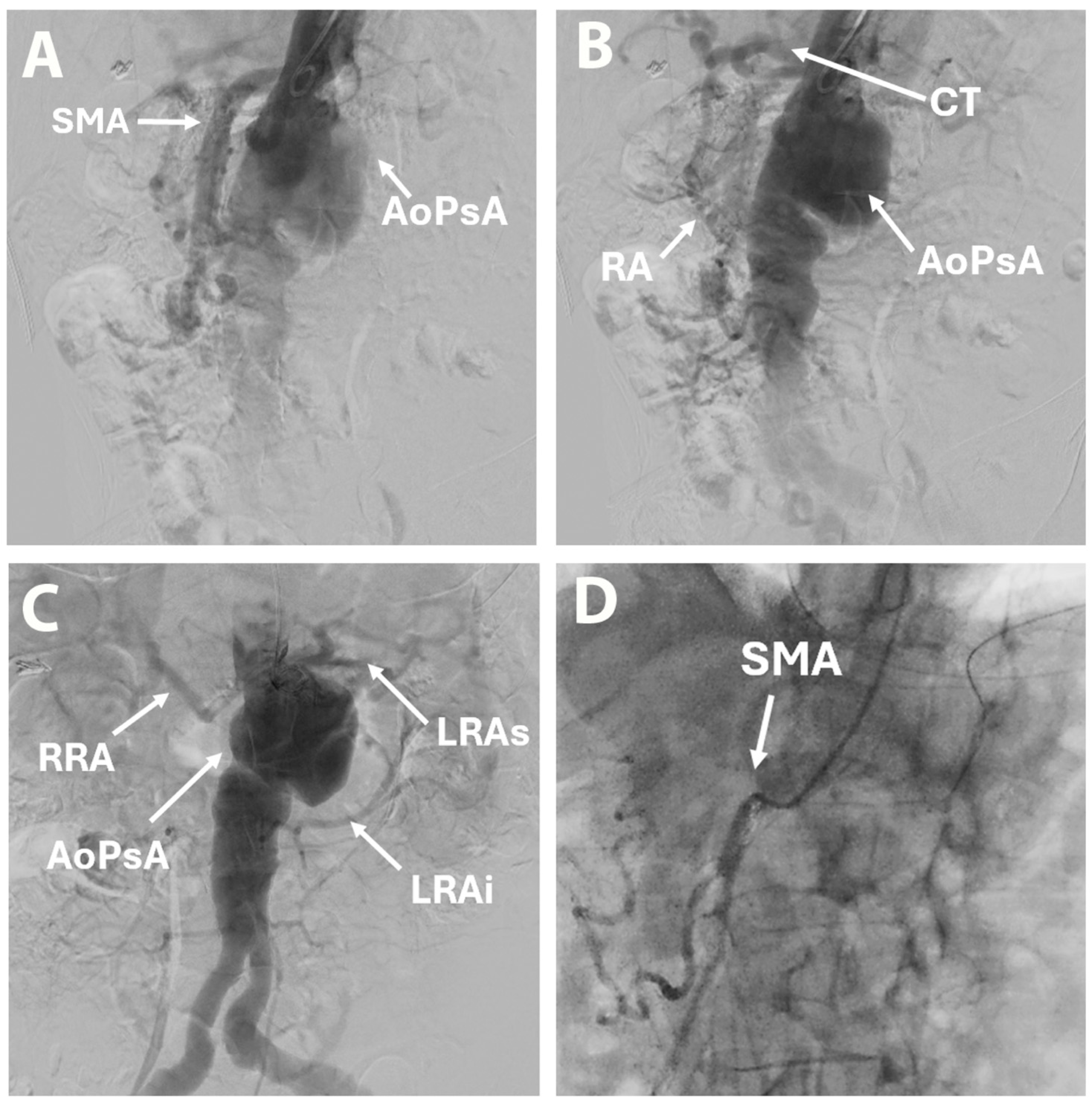- Yeung, K.K.; Nederhoed, J.H.; Tran, B.L.; Di Gregorio, S.; Pratesi, G.; Bastianon, M.; Melani, C.; Riambau, V.; Bloemert-Tuin, T.; Hazenberg, C.E.V.B.; et al. Endovascular Repair of Juxtarenal and Pararenal Abdominal Aortic Aneurysms Using a Novel Low-Profile Fenestrated Custom-Made Endograft: Technical Details and Short-Term Outcomes. J. Endovasc. Ther. 2024, 32, 1988–1993. [Google Scholar] [CrossRef]