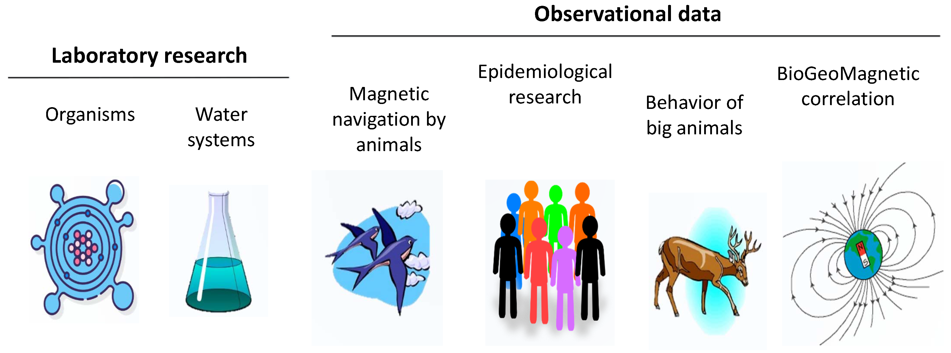 It has been established that various organisms, including humans, can respond to minute changes in MFs, as small as approximately one-thousandth of the geoMF. These phenomena include (see Figure 1) animal magnetoreception [23,24,25] and cardiovascular responses to magnetic storms [13,26]. Such effects have also been observed in laboratory animals [12,27,28]—though infrequently, as nonspecific effects generally exhibit random behavior already at the molecular level. Their impact is often masked by various uncontrolled physicochemical factors [29]. However, these phenomena become statistically significant in large-scale epidemiological studies investigating the correlation between background MFs and disease incidence [30].