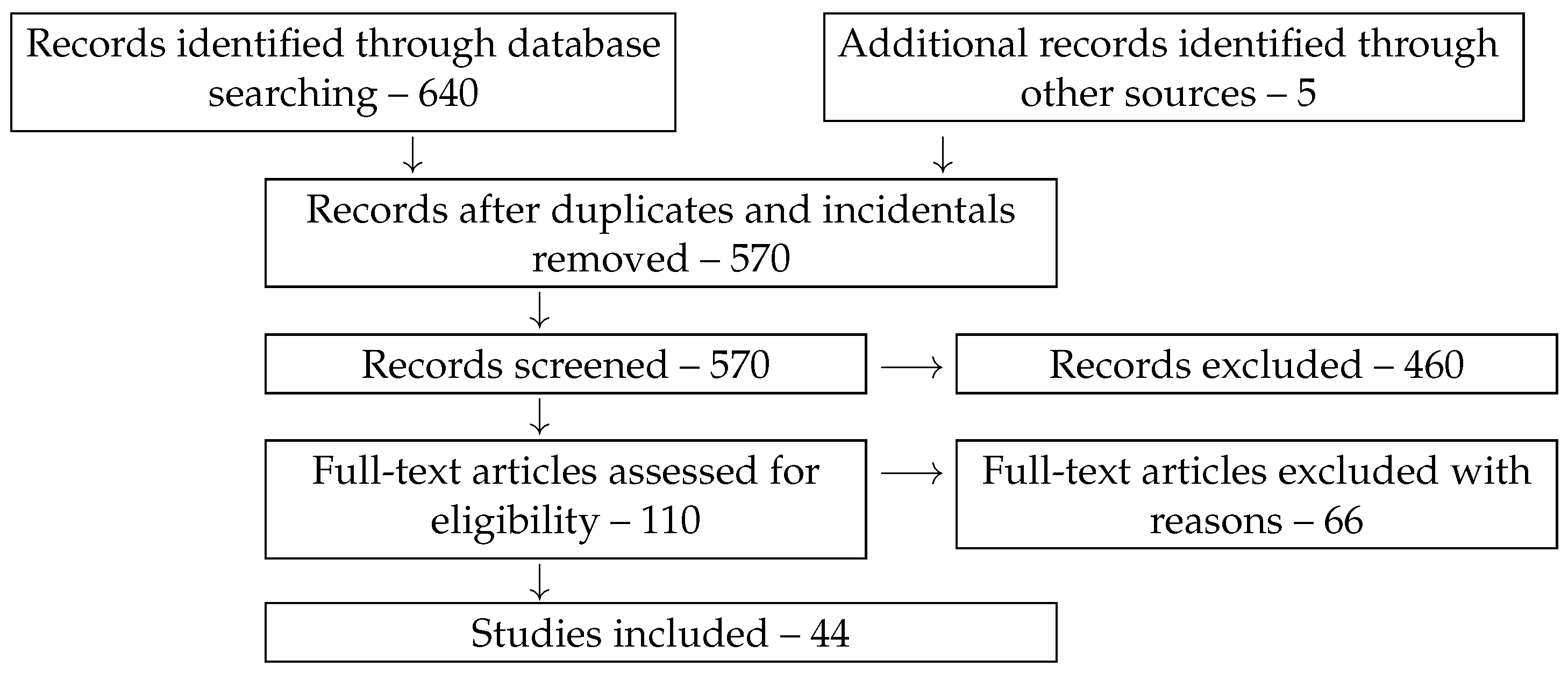 The remaining 110 full-text articles were assessed for eligibility in greater detail. The reasons for further exclusions were as follows: exposure to strong MFs; duplication of work under different titles; duplication in another language; variations of epidemiological studies; unavailability of the source; lack of peer review, i.e., publications in the form of preprints and conference abstracts; further instances of random keyword matching; animal studies; biochemical studies on cells; theoretical and engineering studies; review studies without original data; and methodological inadequacy of works in which authors reported biological effects of picoTesla-level MFs without due instrumental control. As a result, the number of studies included amounted to 44 units, as shown in Figure 2.