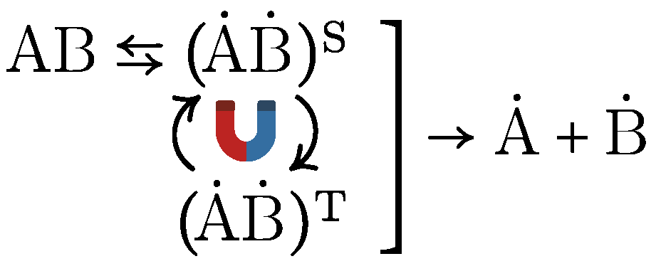 The RPM can be illustrated by the dissociation of a neutral molecule AB into two radicals, A ˙ and B ˙ , forming an intermediate radical pair A ˙ B ˙ , as shown in Figure 6. Under the influence of a MF, this intermediate undergoes intersystem crossing between its spin states—the singlet ( A ˙ B ˙ ) S and triplet ( A ˙ B ˙ ) T . Recombination into the parent molecule AB is spin-selective. Due to the conservation of angular momentum and the Pauli exclusion principle, recombination occurs exclusively from the singlet state. Consequently, the chemical fate of the radical pair depends critically on its spin state. If the correlated (coherent) spin state of the pair persists sufficiently long, the MF—by modulating the intersystem crossing rate—alters the yield of reaction products.