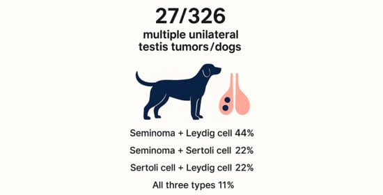 3]. Again, the SEM–ICT combination was most common–8 cases (42%). The remaining were ICT–SCT (5 cases; 26%), SEM–SCT (4 cases; 21%), and SCT–ICT–SEM (2 cases; 11%). This research team also reported a noticeable increase in the frequency of testicular tumors in dogs over the past 40 years. According to the cited authors, testicular tumors affected up to 27% of male dogs. In a study conducted in Brazil by Nascimento et al., among 190 dogs diagnosed with testicular tumors, more than one tumor type was identified in 30 of them (15.8%). Sixteen dogs (8.42%) had different tumors confined to the same testicle, and in four cases, different tumors affected both testes [
