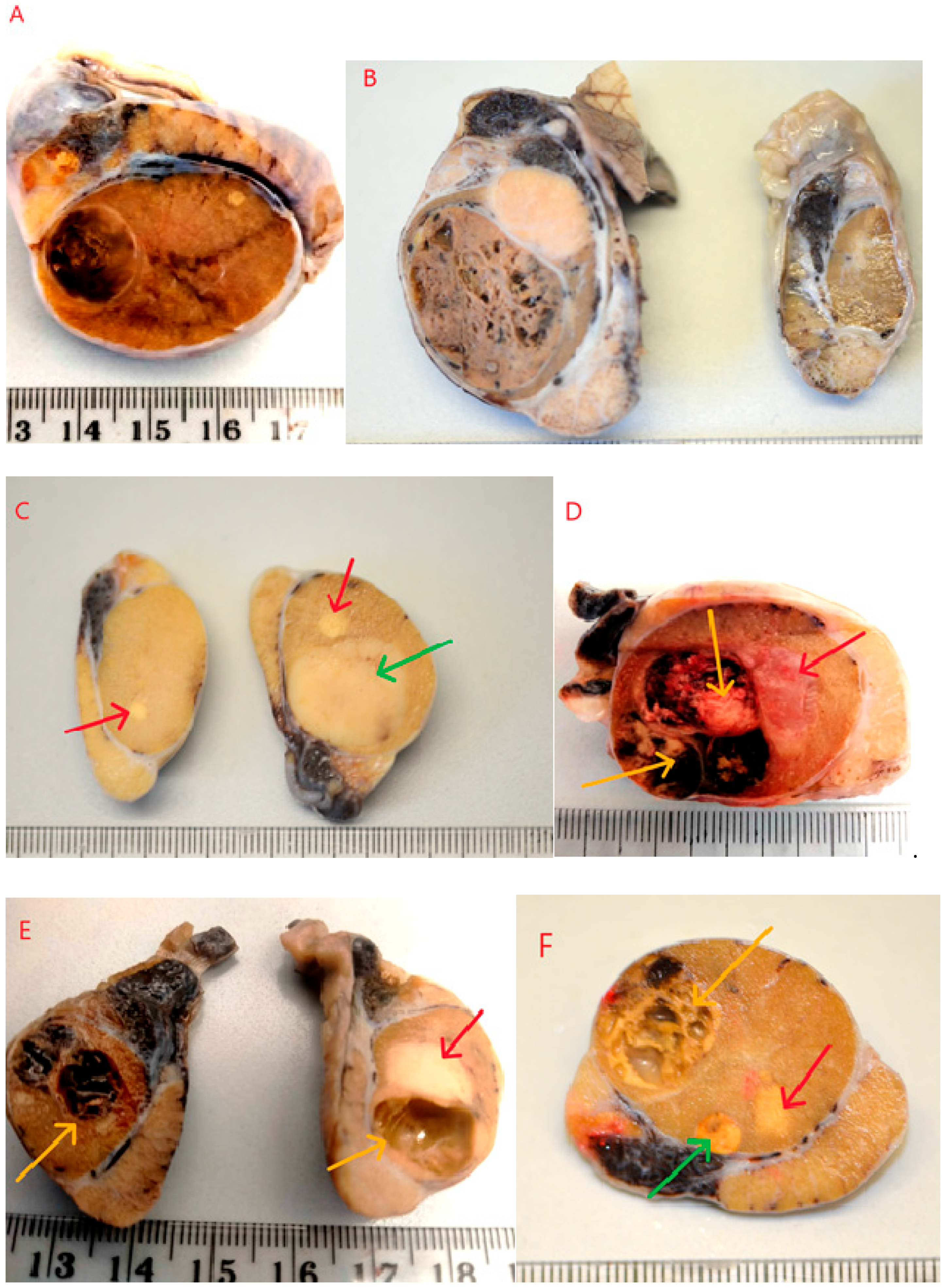 Testicles were cut along their longitudinal axis, revealing an altered internal structure. In most cases, macroscopically distinct or similar solid or cystic lesions were observed, sharply demarcated from the normal testicular parenchyma. In some instances, the lesions did not change the external contour of the testicle. As shown in