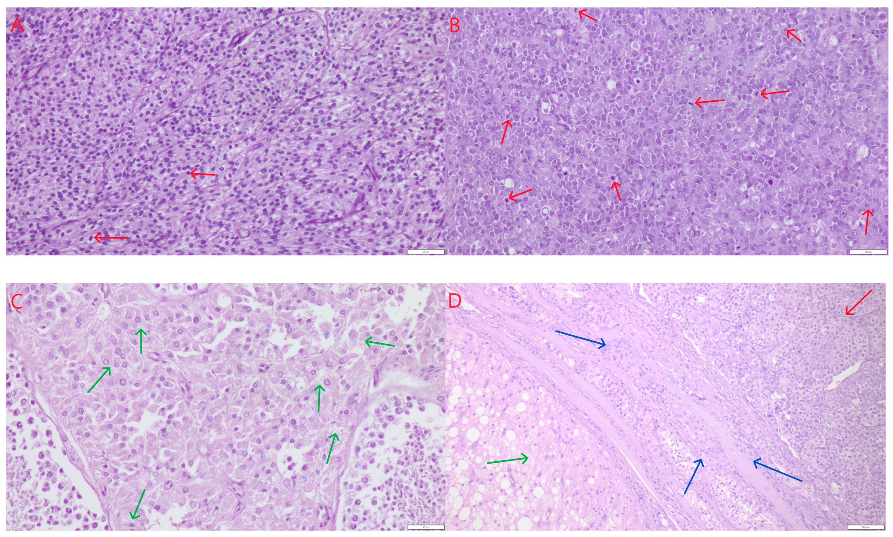 Figure 1A). Such changes were often detected incidentally during sectioning of the testis, following preventive castration or identified preoperatively via ultrasound examination. In some cases, testicles affected by tumors were visibly enlarged compared to the contralateral testicle (