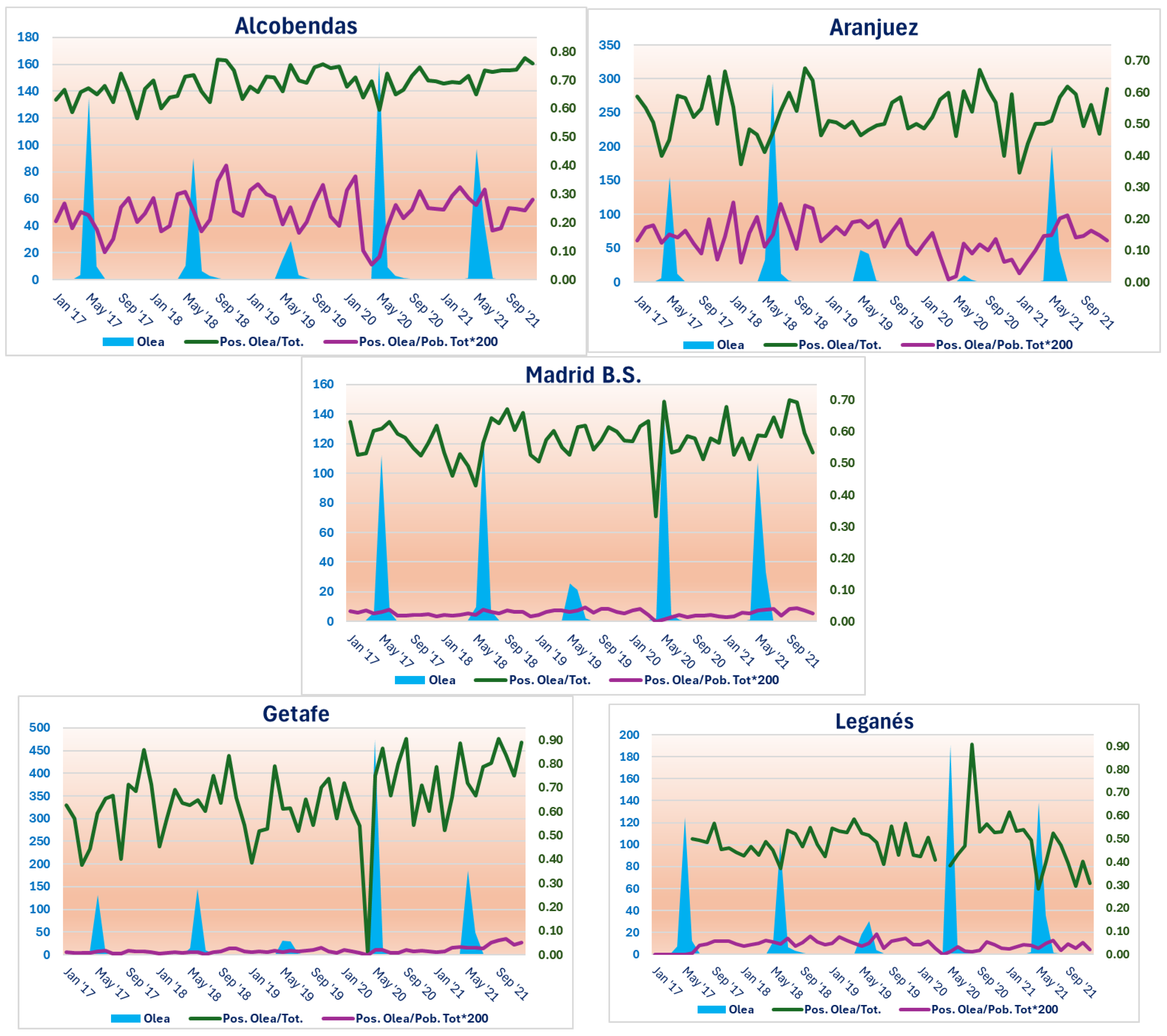 Olea pollen begins to be recorded at the Palinocam Network stations in April, until May or June, with average daily concentrations not exceeding 100 g/m