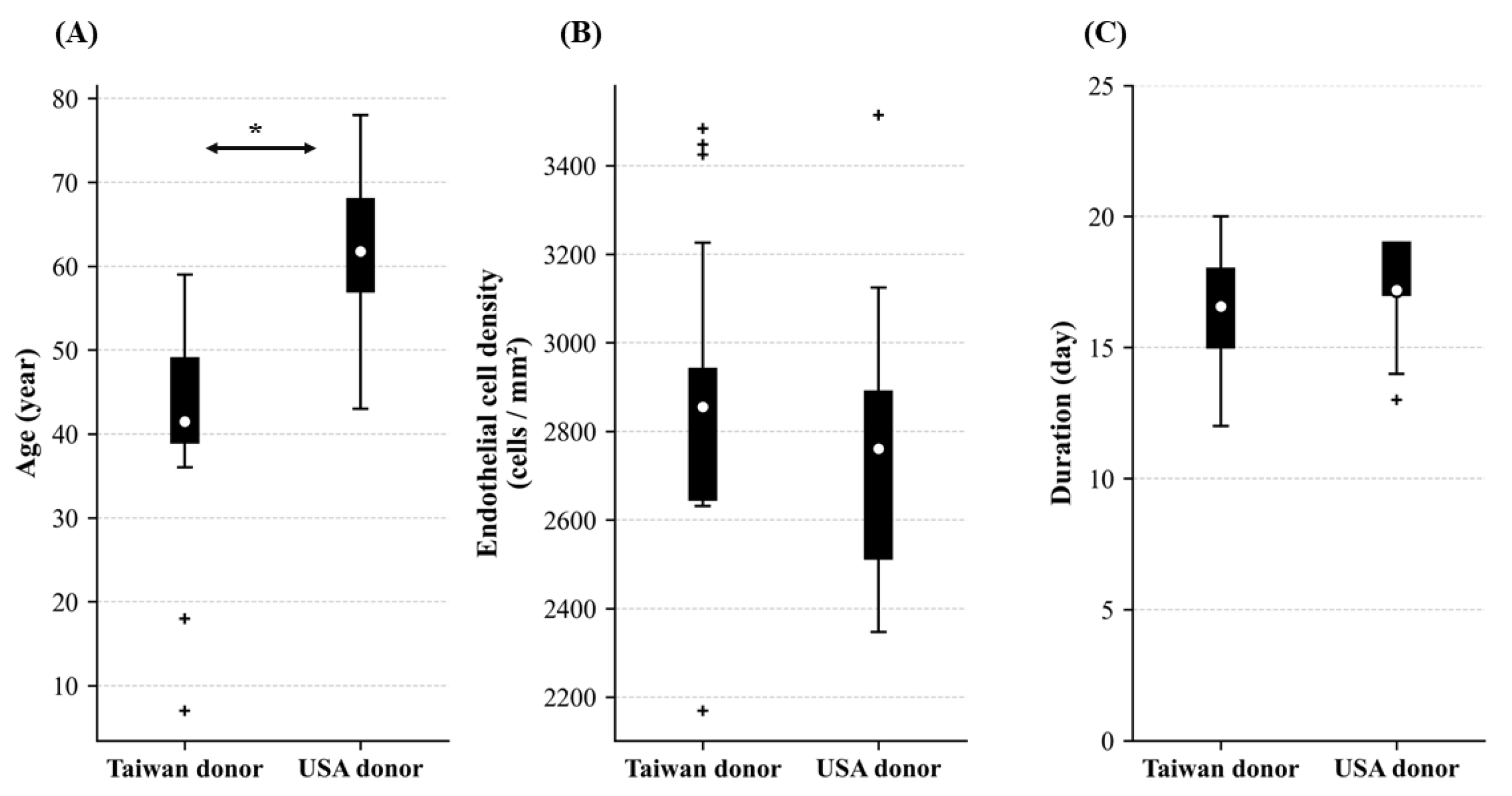 Figure 1. Comparison of donor characteristics between Taiwan and USA. Comparison of donor characteristics, including (A) age (years), (B) corneal endothelial cell density (ECD, cells/mm2), and (C) the duration from death to extracellular vesicle extraction (days), between donors from Taiwan and the USA. Box plots show median, quartiles, and 1.5 × IQR whiskers; + = outliers; ○ = means. p-values from Mann–Whitney U test. * p < 0.05.