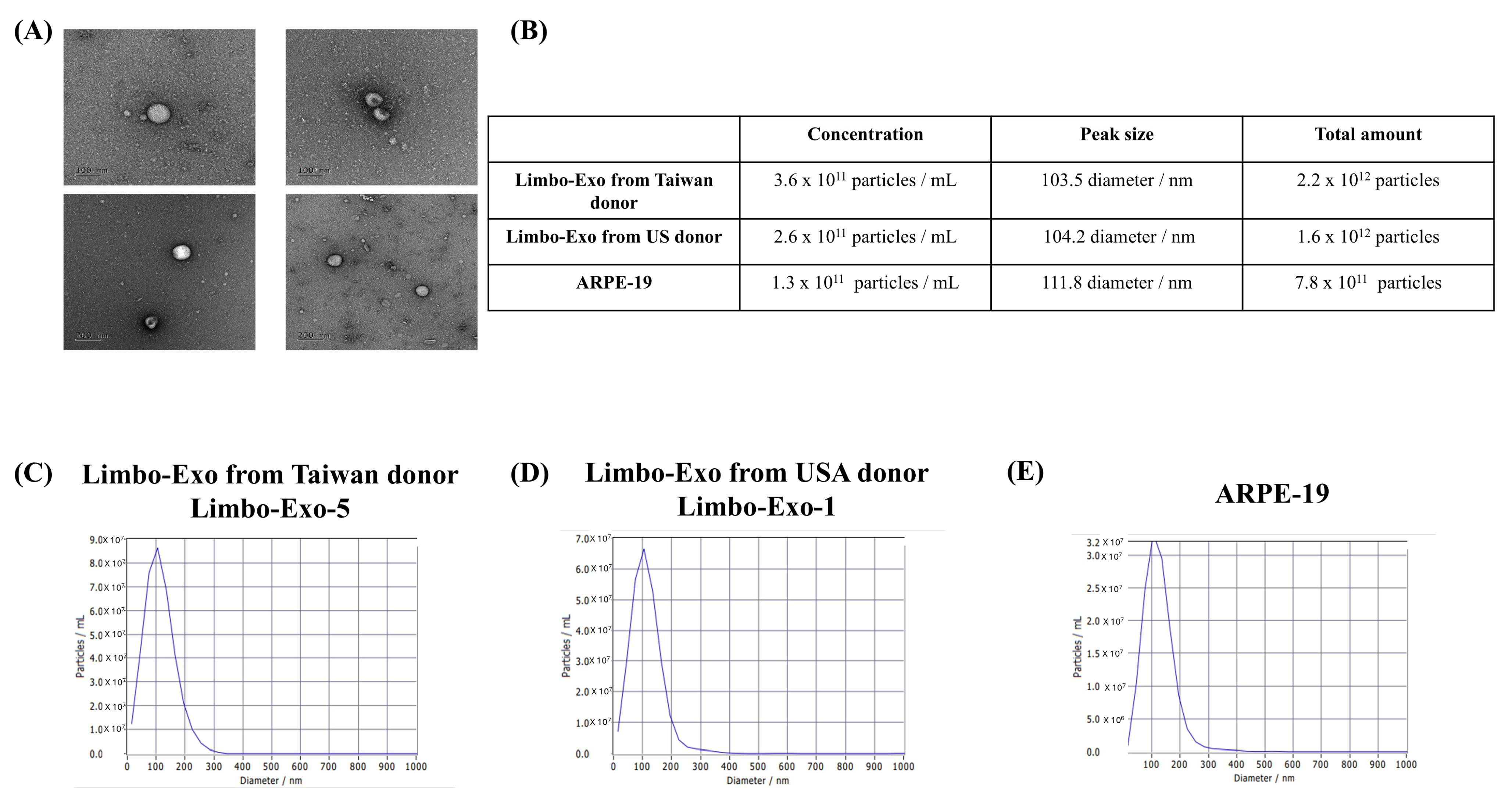 To quantify and characterize the corneoscleral-ring-derived extracellular vesicles, NTA was used to analyze the concentration and peak size. The mean concentration of corneoscleral-ring-derived extracellular vesicles from Taiwan donors was 2.75 × 1011 particles/mL, while that from USA donors was 2.42 × 1011 particles/mL. The mean peak size of extracellular vesicles was 99.21 ± 13.21 nm for Taiwan donors and 99.83 ± 13.11 nm for USA donors. There was no significant difference in extracellular vesicle size and concentration between the two donor origins (Figure 2). By using TEM, the extracellular vesicles derived from corneoscleral rings revealed a typical cup shape appearance and showed a size range between 50 and 100 nm (Figure 3A). To further investigate the size distribution of corneoscleral-ring-derived extracellular vesicles, we compared the corneoscleral-ring-derived extracellular vesicles from Taiwan and USA donors (Limbo-Exo-5 and Limbo-Exo-1, respectively, from Taiwan and USA origin) with those derived from human retinal pigment epithelial (ARPE-19) cells, and found them to be similar (Figure 3C–E). Notably, the concentration and total amount of corneoscleral-ring-derived extracellular vesicles was significantly higher than in the 2-D culture of APPE-19 cells (Figure 3B). The ARPE-19 cell line was obtained from the American Type Culture Collection (ATCC). These results indicated that human corneoscleral-ring-derived extracellular vesicles exhibited a similar peak size and size distribution to those from human RPE cells, but were present in higher amounts after extraction.