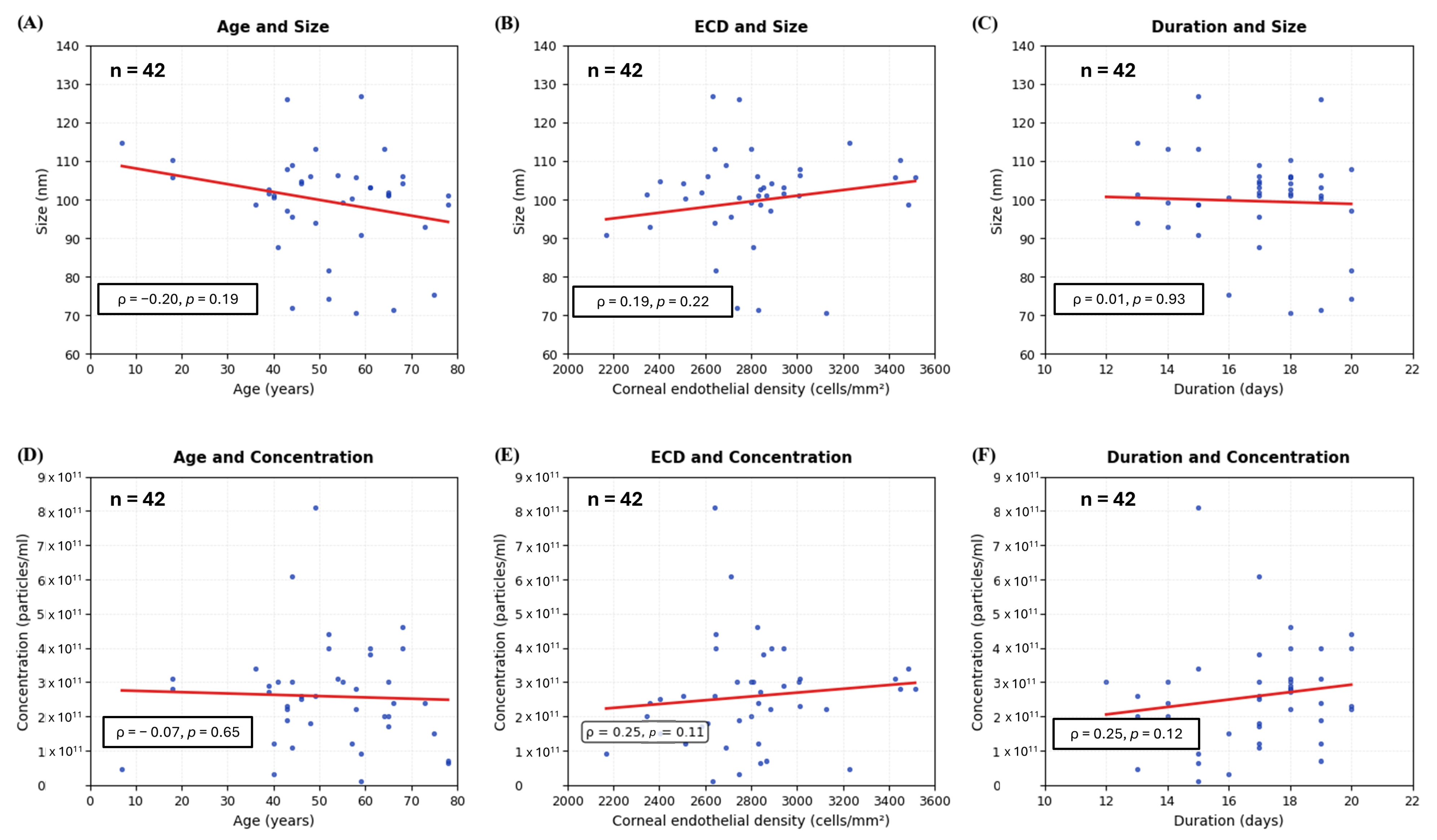 Figure 4. Extracellular vesicle properties versus donor characteristics. (A,D) Age correlations with extracellular vesicle size and concentration. (B,E) Corneal endothelial cell density (ECD) correlations with extracellular vesicle size and concentration. (C,F) Duration from death to extraction correlations with extracellular vesicle size and concentration. Each point represents one donor sample. Linear regression lines (red) and Spearman correlation statistics (ρ, p-value) are shown. All correlations were non-significant. Each scatter plot represents data from 42 donors (n = 42).