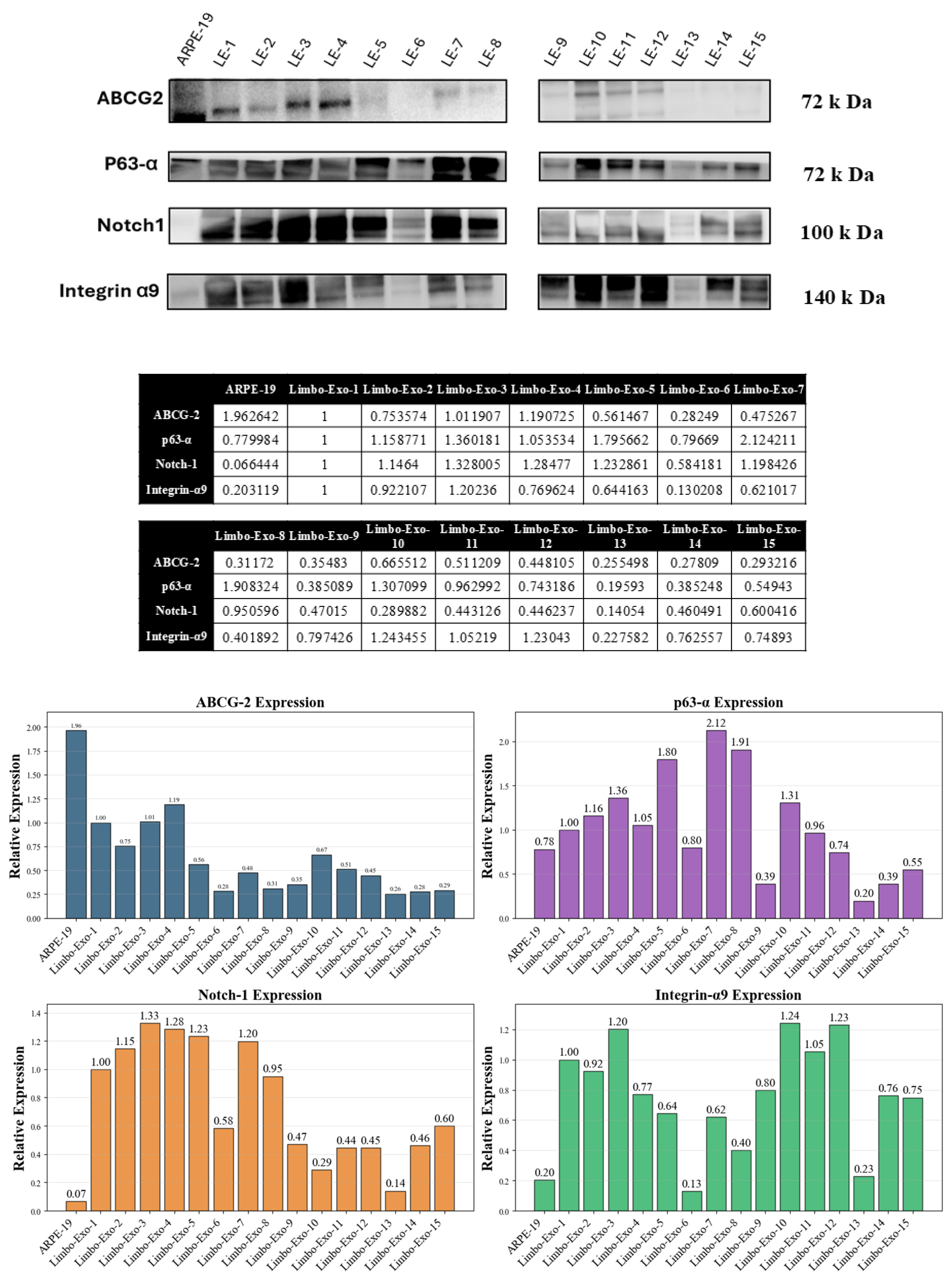 Figure 6. Western blot analysis of limbal stem-cell-associated markers in isolated extracellular vesicles. Representative immunoblots demonstrate the expression of key limbal stem cell markers including ABCG-2 (72 kDa), p63-α (72 kDa), Notch-1 (100 kDa), and Integrin α9 (140 kDa) in extracellular vesicles derived from different donors (Limbo-Exo-1 through Limbo-Exo-15) compared to ARPE-19 control cells. Quantitative analysis (right panels) shows relative protein expression levels normalized to Limbo-Exo-1. The presence of these established limbal stem cell markers in the isolated extracellular vesicles confirms the limbal stem cell origin and validates the successful enrichment of limbal stem-cell-derived extracellular vesicles. LE = Limbo-Exo, RPE = retinal pigment epithelia.