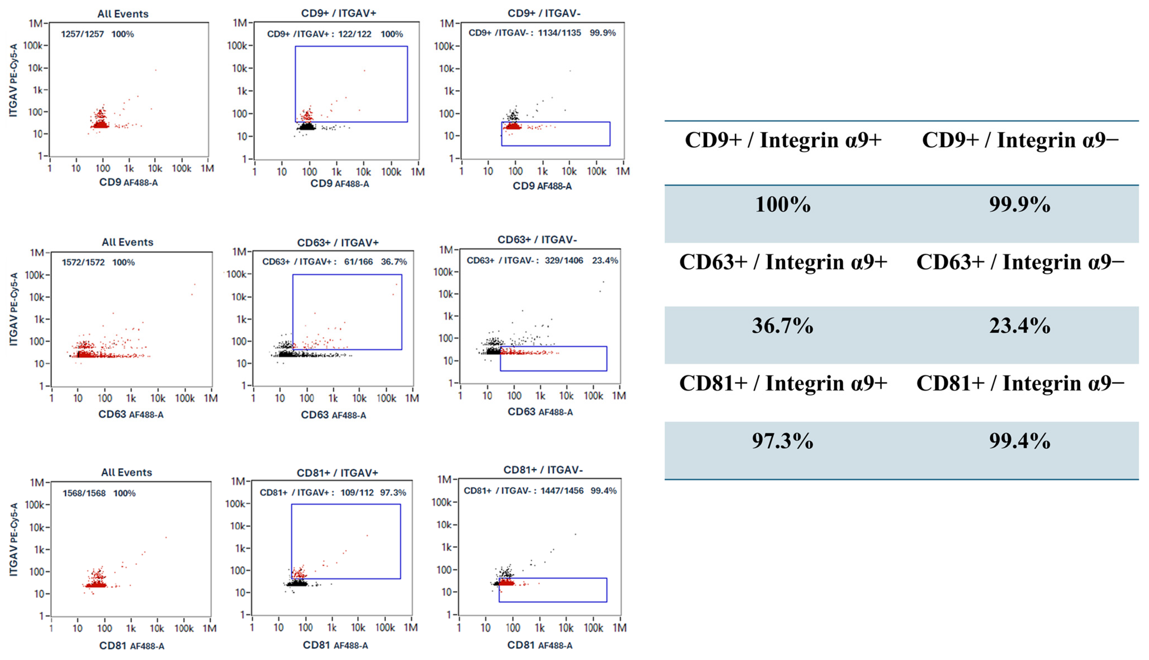 Figure 7. Nanoparticle flow cytometry (NanoFCM) analysis. Nanoparticle flow cytometry (NanoFCM) analysis identified extracellular vesicles subpopulations positive for integrin α9 and the tetraspanin exosomal markers CD9, CD63, and CD81. Fluorescent antibody staining enabled detection and sorting. NanoFCM experiments were performed by Reliance Biosciences.
