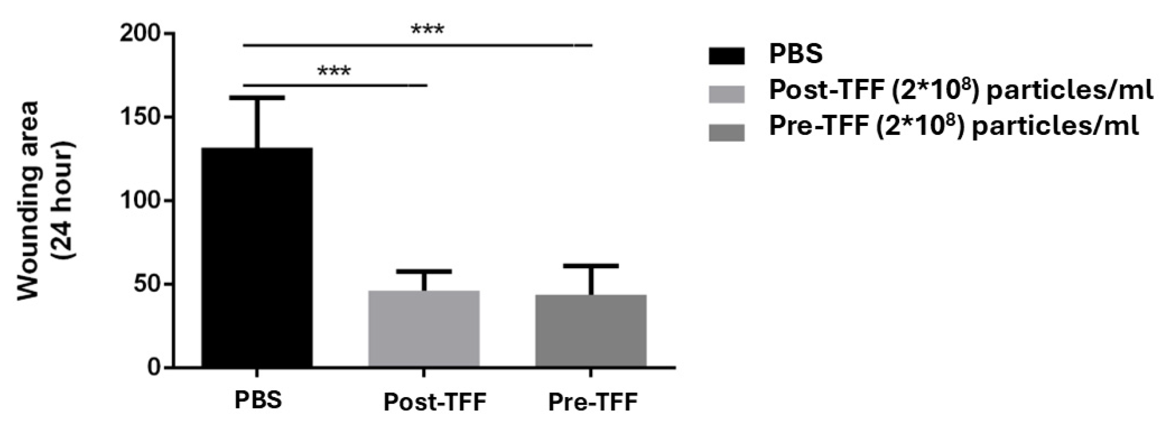 Figure 9. HCE-T cell wound healing assay between extracellular vesicles derived from corneoscleral rings processed with or without tangential flow filtration (TFF). Comparison of 24 h wounding area among PBS, Post-TFF (2 × 108 particles/mL), and Pre-TFF (2 × 108 particles/mL) treatments. Data represent mean ± SD. Statistical significance is indicated by *** (p < 0.001). Both Post-TFF and Pre-TFF treatments significantly reduced the wounding area compared to PBS control. There was no significant difference between Post-TFF and Pre-TFF treatments. PBS: phosphate-buffered saline; TFF: tangential flow filtration.