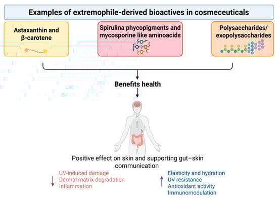 In the pursuit of innovative and sustainable solutions for skin health, the cosmetic and nutraceutical industries are increasingly converging. This intersection has given rise to cosmeceuticals and nutricosmetics, formulations that combine topical and systemic approaches to promote skin resilience, beauty, and overall wellness. Within this evolving landscape, extremophiles capable of thriving in the most inhospitable environments on Earth are emerging as a novel and powerful source of bioactive compounds [,]. Extremophiles inhabit geochemically extreme niches such as deep-sea hydrothermal vents, hypersaline lakes, acidic springs, and polar ice []. Their ability to survive under conditions of intense heat, cold, pressure, dryness, salinity, radiation, and pH is made possible by unique molecular adaptations, including the production of extremozymes, extremolytes, and protective pigments []. These molecules not only ensure cellular integrity and DNA repair in harsh environments, but also exhibit properties highly desirable in skincare, such as antioxidant activity, UV protection, hydration, and anti-inflammatory effects [,]. The skin, constantly exposed to environmental stressors, undergoes structural and functional changes that accelerate aging, reduce elasticity, and compromise immune defense. Climate change and urban pollution further exacerbate these effects, making the need for adaptive and protective skincare more urgent than ever. Extremophile-derived compounds offer a biologically inspired solution: they work in harmony with the skin’s natural functions, enhance its ability to cope with stress, and possess excellent stability and compatibility with human metabolism []. Moreover, the evolutionary significance of extremophiles, some of which may represent the earliest forms of life, has led to renewed interest in their classification, with archaea proposed as a distinct domain due to their unique biochemistry and ribosomal RNA structure []. Their resilience and versatility have made them valuable not only in cosmetics, but also in medicine, biotechnology, and astrobiology [,,,]. From a biotechnological perspective, extremophile-derived compounds offer advantages in terms of sustainability, scalability, and compatibility with skin physiology. Their enzymes are already used in industrial processes such as PCR diagnostics, bioremediation, and drug synthesis []. In cosmetics, their long shelf life, metabolic compatibility, and ability to mimic natural skin defense mechanisms make them ideal candidates for next-generation formulations. This review provides a comprehensive overview of extremophile-derived bioactives with relevance to both topical and systemic skincare. We detail the molecular adaptations that underpin their biosynthesis; analyze their cosmetic and nutraceutical applications, including enzymatic exfoliation, UV protection, hydration, and gut–skin axis modulation; and discuss sustainable production strategies such as microbial fermentation and synthetic biology. By bridging cosmeceutical efficacy with environmental resilience, extremophiles emerge as a strategic resource for next-generation, science-driven skincare. In addition, this review advances beyond previous works by offering a comparative and multidisciplinary assessment linking molecular mechanisms, biotechnological production, and translational potential in cosmetic and nutraceutical fields.