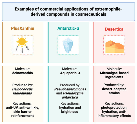 Examples of commercial applications of extremophile-derived compounds in cosmeceuticals: PlusXanthin from Deinococcus radiodurans, Antartic-G from Pseudoalteromonas and Pseudozyma antarctica, Desertica from desert-adapted strains.