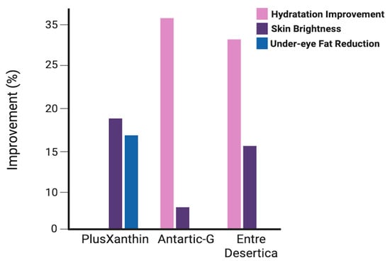 Among the extremophile-derived ingredients analyzed, as shown in Figure 5, Antarctic-G stands out for its superior hydrating properties, making it particularly suitable for formulations aimed at protecting the skin from environmental stress. Desertica, derived from desert-adapted microalgae, is especially effective in enhancing skin brightness and combating dryness, positioning it as an ideal candidate for sun-exposed or arid skin types. In contrast, PlusXanthin demonstrates targeted action on the periocular area, with notable effects on fat reduction and pigmentation, supporting its use in anti-aging and eye contour treatments. These comparative results highlight the complementary profiles of extremophile-derived ingredients. Their distinct mechanisms and clinical outcomes support the development of multi-targeted cosmeceutical formulations, especially when combined in synergistic delivery systems. This diversity also reinforces the value of extremophiles as a sustainable reservoir of specialized bioactives for tailored skincare solutions. Beyond sourcing, sustainability is embedded in formulation strategies. For instance, upcycled phenolic extracts from lychee and dragonfruit peels—obtained via green solvents—exhibit strong antioxidant and anti-tyrosinase activity (92.3% inhibition), demonstrating how waste valorization can yield high-performance activities []. Likewise, alkyl glucosides, derived from coconut, corn, or potato, serve as biodegradable surfactants, replacing petrochemical emulsifiers in cleansers and shampoos []. Marine algae extracts, rich in fucoidan and phlorotannins, support anti-aging and collagen synthesis, with clinical improvements in dermal density (+40%) and wrinkle reduction (−35%). Their harvesting from renewable marine biomass aligns with blue bioeconomy principles []. Packaging innovations further reinforce sustainability. Unilever’s refill-reuse pilots and Lush Cosmetics’ naked products exemplify circular design, reducing virgin plastic use and promoting consumer engagement []. Emerging technologies include biodegradable active films, which release antioxidants or antimicrobials over time, enhancing product performance while minimizing waste. The concept of nutricosmetics, which emphasizes inside-out beauty, is gaining traction. Products combining topical and oral delivery systems, such as Imedeen®, Skinade®, and NutraFusion™, integrate marine collagen, vitamins, and plant extracts to deliver systemic and dermal benefits. These combined delivery platforms not only enhance efficacy but also reflect a holistic approach to wellness, aligning with consumer demand for integrative and sustainable skincare.