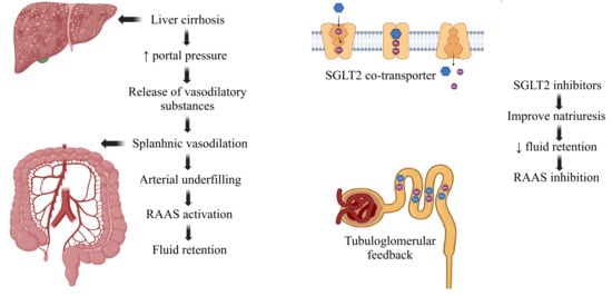 Although a robust body of work supports SGLT2i use in earlier stages of metabolic dysfunction, associated steatotic liver disease (MASLD), with reported reductions in liver stiffness, hepatic enzymes and visceral adiposity, along with improved insulin sensitivity and a potential slowdown in progression to cirrhosis, evidence in advanced disease remains limited [,,,,]. The same glycosuric action that underpins their antidiabetic efficacy also increases susceptibility to genitourinary infections, a concern that may be magnified in cirrhosis owing to impaired immune defenses [,]. Moreover, as with loop diuretics, the baseline circulatory instability of many patients with cirrhosis, characterized by hypotension and RAAS dysregulation, can heighten the risk of acute kidney injury and/or hepatorenal syndrome, disturb electrolyte balance, exacerbate hepatic encephalopathy and potentially contribute to sarcopenia, which adversely affects long-term outcomes [,,,,].
