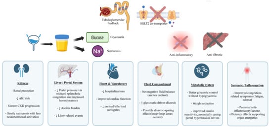 Fluid-compartment data using bioimpedance suggest the drugs preferentially reduce extracellular (particularly interstitial) water when pre-treatment Extracellular Water/Total Body Water is high, with minimal change when it is low, and may remove proportionally more interstitial than intravascular fluid compared with other diuretics, features that could help reduce ascites while limiting dehydration and intravascular volume loss [,]. Overall, in cirrhotic patients with hyponatraemia, SGLT2i can induce natriuresis alongside sodium-independent water excretion and neurohumoral adjustments that together tend to raise, rather than lower, serum sodium [,,]. However, dedicated studies are needed to define efficacy, safety and patient selection for sodium regulation in this population. Figure 2 presents, at the organ level, the proposed effects of SGLT2i in cirrhosis, including reduced portal pressure and ascites, renal protection and cardiometabolic benefits.