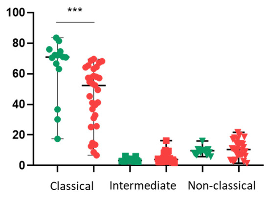 Monocyte subpopulation distribution in control subjects and patients with CAD. Percentage of classical (CD14++CD16−), intermediate (CD14++CD16+), and non-classical (CD14+CD16++) monocytes in the peripheral blood of control subjects (green) and preoperative patients with CAD (red). Statistical significance was determined using the Mann–Whitney U test. *** p < 0.001.
