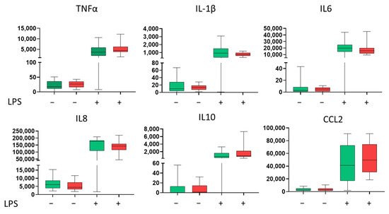 Basal and lipopolysaccharide (LPS)-stimulated cytokine secretion by primary monocytes. Concentration (pg/mL) in the 24 h culture supernatants of primary monocytes isolated from control subjects (green) (n = 20) and preoperative CAD patients (red) (n = 34). Cells were cultured under either basal (unstimulated) or LPS-stimulated (1 µg/mL) conditions. Green represents controls, and red—CAD patients. Statistical significance was calculated using the Mann–Whitney U test, as the data did not follow a normal distribution. The results are presented as box plots, where the centre line represents the median, the box boundaries indicate the first and third quartiles (Q1 and Q3), and the whiskers show the minimum and maximum values.
