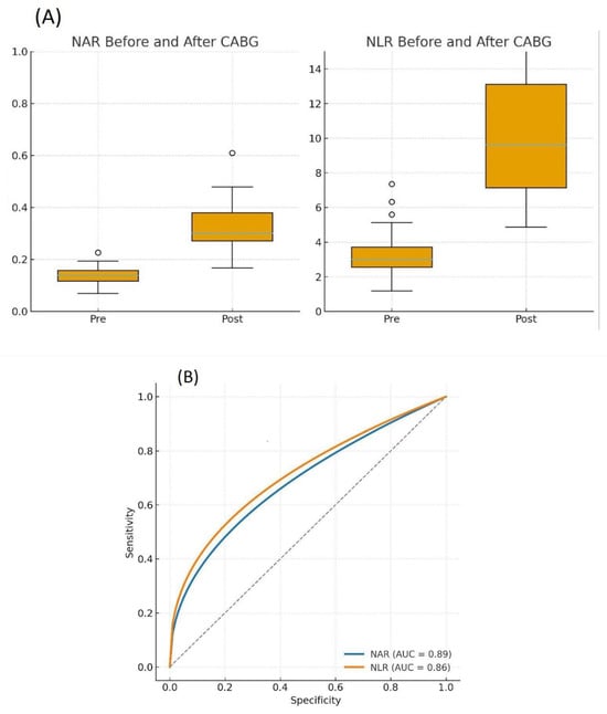 ROC curve analysis was performed to compare the ability of postoperative NAR and NLR to distinguish the postoperative state from the preoperative condition. Both ratios performed well, but NAR demonstrated a numerically higher area under the curve (AUC) than NLR (NAR AUC: 0.89, 95% CI 0.79–0.97 vs. NLR AUC: 0.86, 95% CI 0.75–0.95)). However, this difference was not statistically significant (p = 0.27) (Figure 3B and Table 3). An optimal NAR cut-off value of 0.21 provided a sensitivity of 82.4% and a specificity of 100% for identifying the postoperative state.
