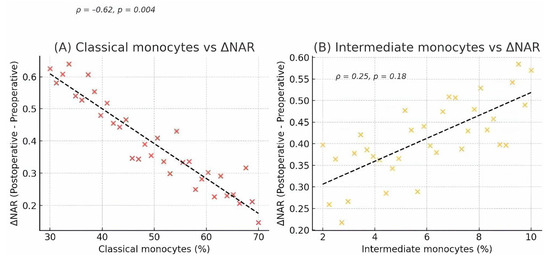 To directly test our primary hypothesis, we correlated baseline monocyte percentages with the change in NAR (ΔNAR). A significant inverse correlation was found between the percentage of classical monocytes and ΔNAR (ρ = −0.62, p = 0.004), indicating that a greater preoperative skew away from classical monocytes predicted a more severe subsequent inflammatory response (Figure 4).