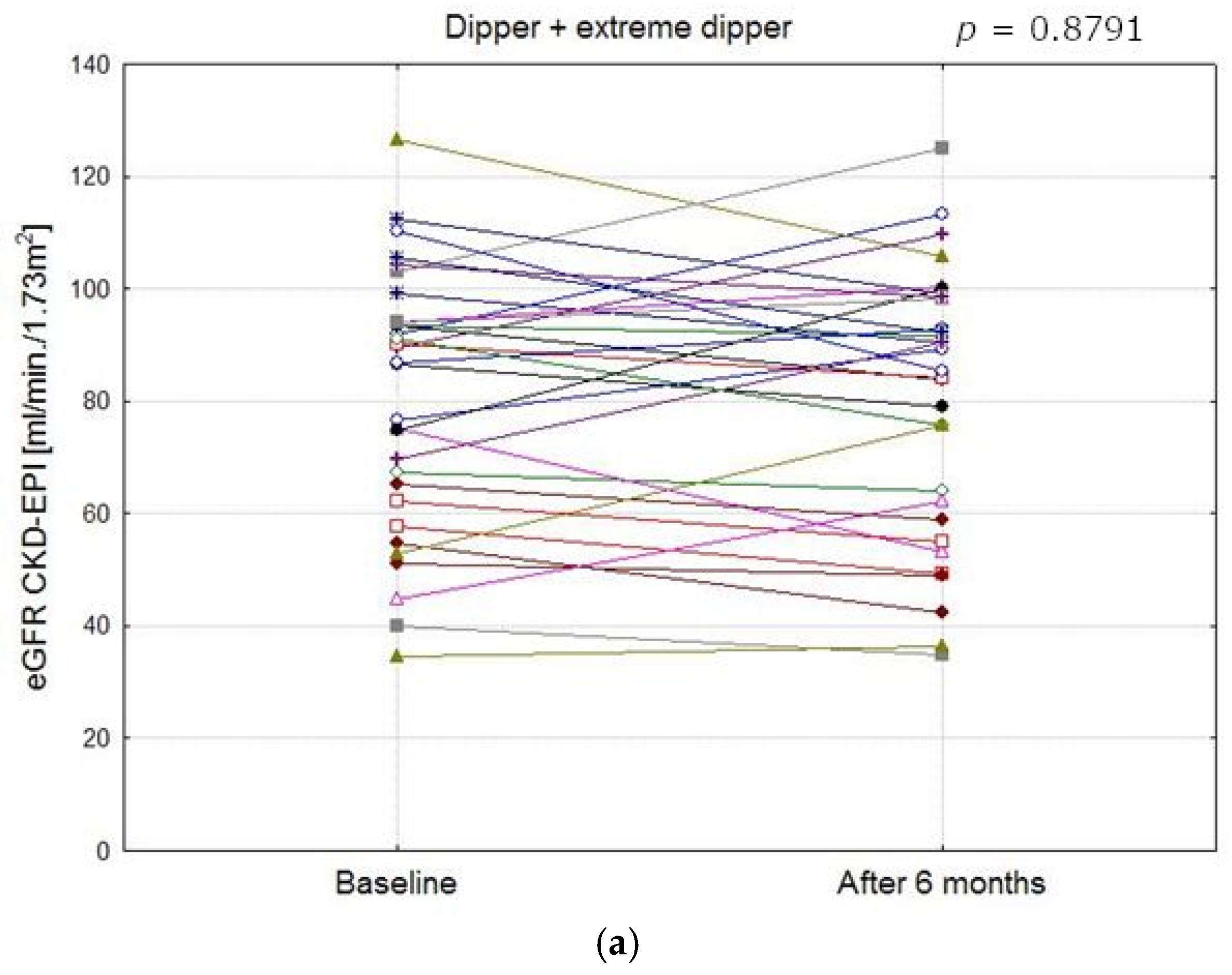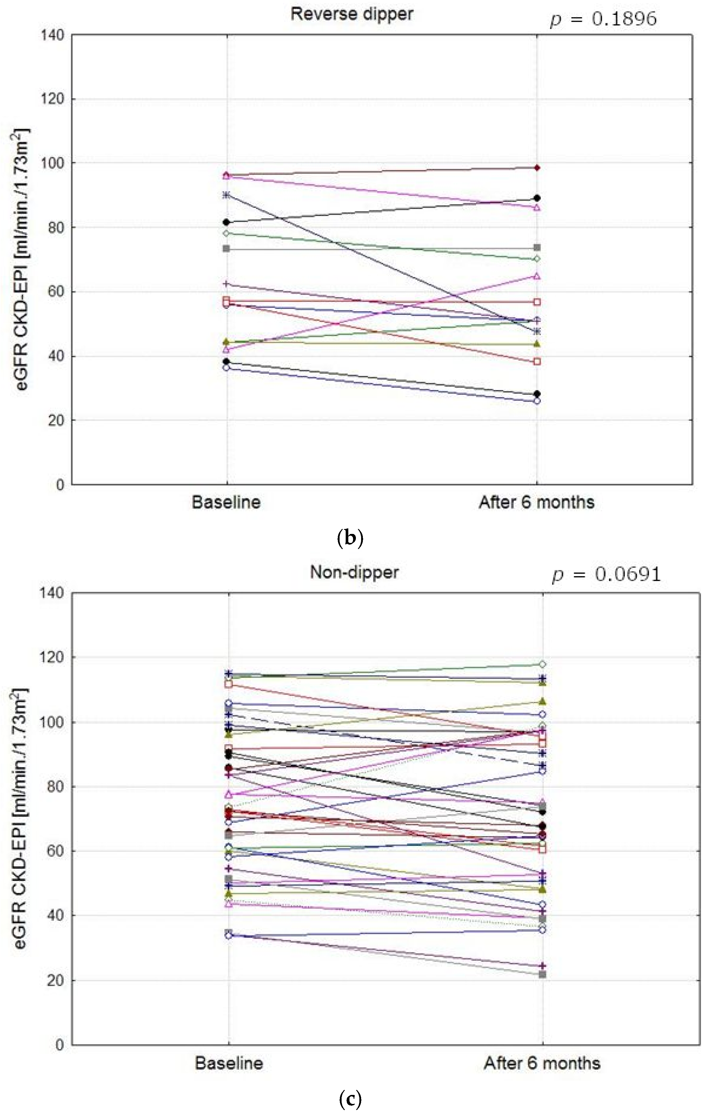 - Borrelli, S.; Garofalo, C.; Gabbai, F.B.; Chiodini, P.; Signoriello, S.; Paoletti, E.; Ravera, M.; Bussalino, E.; Bellizzi, V.; Liberti, M.E.; et al. Dipping Status, Ambulatory Blood Pressure Control, Cardiovascular Disease, and Kidney Disease Progression: A Multicenter Cohort Study of CKD. Am. J. Kidney Dis. 2023, 81, 15–24.e1. [Google Scholar] [CrossRef]