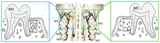 Operations were performed according to a previously published protocol using an operation microscope (OPMI pico f170, Carl Zeiss AG, Oberkochen, Germany) under general anesthesia by subcutaneous injection of buprenorphine (0.05 mg/kg body weight) and intraperitoneal injection of sodium pentobarbital (30–50 mg/kg body weight) []. Additionally, local anesthesia using articaine hydrochloride 4% was injected palatal into the first upper molars (M1) mucosa. After marginal and additionally mesial incision, the development of a mucoperiosteal flap was conducted by blunt palatal dissection of M1. Between the mesial and the first palatal root of M1, a defect with a length, width, and depth of 1 mm each was created using piezosurgery while strictly protecting the roots. Analogously, this procedure was performed on the opposite M1 in a split mouth manner. Six of the artificially created, three-walled bone defects were augmented with alloplastic bone grafts (BoneCeramic®, Straumann AG, Basel, Switzerland) and served as controls. Fifteen of the defects were treated using alloplastic bone substitute material with DPSCs, and an additional fourteen defects were filled with DPSCs cultivated on particulate alloplastic bone substitute material in addition to EVs. In accordance with the described procedure with the alloplastic bone graft material, six three-walled defects were treated with xenogeneic bone substitute material (BioOss®, Geistlich AG, Wolhusen, Switzerland) and served as controls. Fourteen defects were treated with xenogeneic bone substitute and DPSCs. Xenogeneic bone with DPSCs and EVs were inserted into fifteen bone defects (Table 1 and Figure 2). The distribution of the treatments was carried out according to a split mouth model. After augmentation, a collagen membrane (Bio-Gide®, Geistlich AG, Switzerland) was placed on top of the particulate grafts, and the mucoperiosteal flap was returned to its original position. Tension-free suturing was conducted with single 7-0 button sutures (Vicryl 7-0, Ethicon Inc., Raritan, NJ, USA) at the mesial incision. In total, two animals died under general anesthesia due to respiratory failure. The animals were autopsied, and no cause other than respiratory failure due to drug-induced respiratory depression could be found. Postoperative controls and inspections of the oral cavity were carried out in accordance with the approved regulations of the animal protocol. At the end of the experiment, the animals were euthanized.