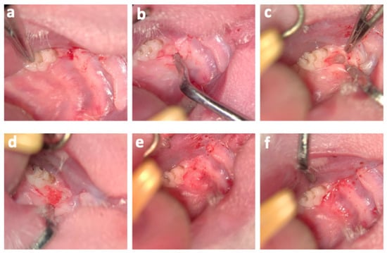 Photos of the surgical procedure: (a) Illustration of the incision. (b) Blunt subperiosteal dissection and elevation of a mucoperiosteal flap. (c) The surgically created intrabony defect. (d) Placement of particulate bone substitute material into the defect. (e) Tension-free adaptation of the wound margins. (f) Postoperative situation showing the gingival sutures.