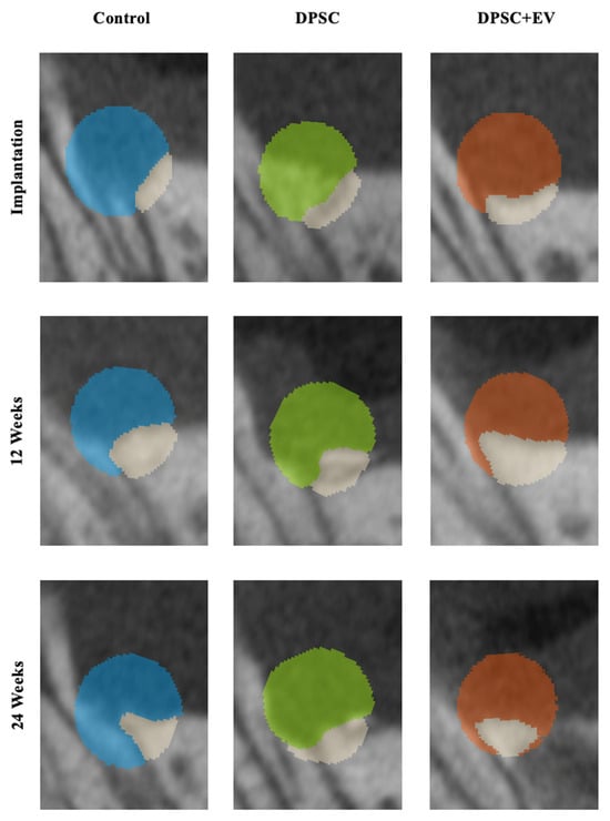 Representative two-dimensional sections from the µCT images with color coding of the ROI in the area of the periodontal jaw defects with alloplastic bone substitute material. Light blue = control; light green = DPSC; brown = DPSC + EV.