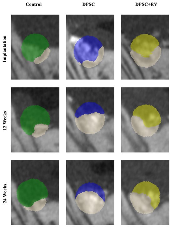 Representative two-dimensional sections from the µCT images with color coding of the ROI in the area of the periodontal jaw defects with xenogeneic bone substitute material. Green = control; blue = DPSC; yellow = DPSC + EV.