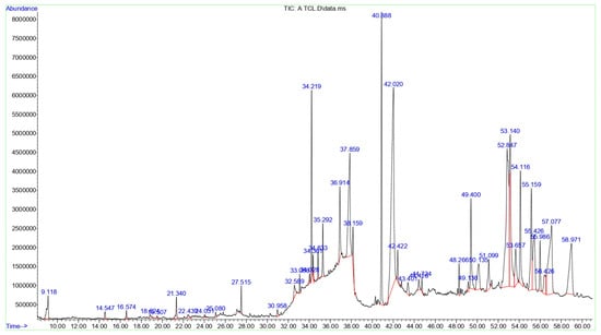 The GC-MS chromatograms of T. terrestris SE. A prominent peak in the spectrum indicates the major component of the extract, and every peak reflects a recognized chemical.