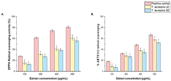 Antioxidant activity of T. terrestris LE and SE. (A) DPPH reducing power and (B) ABTS+ scavenging activity at various concentrations (100–800 μg/mL). An ascorbic acid (100–800 µg/mL) was used as a positive control. The mean value of 3 independent experiments is presented. The scavenging activity of T. terrestris LE and SE was significantly lower (*) than the positive control at a significance level of p < 0.05. + = radical cation.