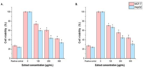 The effect of T. terrestris (A), LE and (B), SE on MCF-7 and HepG2 cell viabilities using the MTT assay. Cells were treated with the T. terrestris LE and SE (125, 250, 500, and1000 µg/mL) for 24 h. Mean values ± SD of three independent experiments are shown. (* p < 0.05 compared to non-treated cells (negative control)).