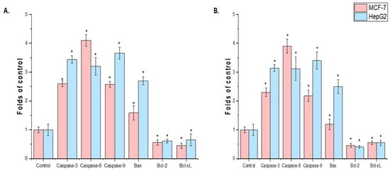 Ethanol extracts from T. terrestris seeds and leaves were evaluated for their effects on HepG2-induced apoptotic signaling and MCF-7. The MCF-7 and HepG2 cell lines treated with seed extract showed higher levels of mRNA expression, according to the rRT-PCR study. Anti-apoptotic genes (Bcl-xL and Bcl-2) were expressed less in the MCF-7 and HepG2 cell lines treated with plant extract than in the control group (p < 0.05) (Figure 5A,B).