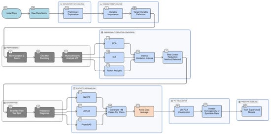 A Multicollinearity analysis between variables was assessed using the variance inflation factor (VIF) in order to avoid redundance in clinical variables. In addition, for the initially heterogeneous distribution, applying synthetic oversampling techniques is recommended in the scientific literature []. Using SMOTE (Synthetic Minority Over-sampling Technique), LORAS (Localized Random Affine Shadowsampling) and ProWRAS (Proximity Weighted Random Affine Shadowsampling), each method generated new synthetic instances of the minority class, preserving the topological structure of the feature space. Subsequently, the resulting data were reduced to two dimensions using PCA, in order to visualize the generated distributions and evaluate the capacity of each technique to improve the representativeness and homogeneity of the minority samples with respect to the majority class.