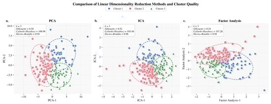 Linear dimensionality reduction comparison methods. (a) PCA: projection of three clusters in two principal components. (b) ICA: cluster separation in independent component space. (c) Factor Analysis: representation of linear separability across factors.