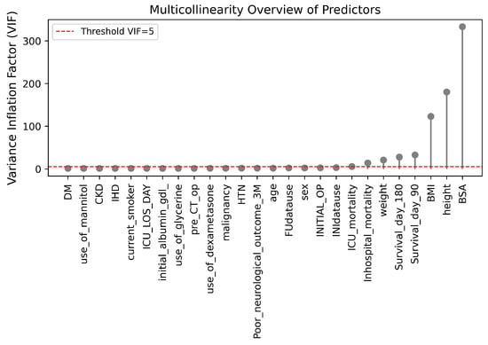 A multicollinearity study was carried out using the VIF with the objective of analyzing redundancy between clinical variables. Variables related to subsequent outcomes (Survivalday90, Survivalday180) were excluded in order to avoid data leakage and confounding biases associated with treatment. The remaining variables showed acceptable independence (VIF < 5), as represented in Figure 8, except for the anthropometric parameters BMI, height, weight, and BSA, whose VIF values were high, which was expected due to their algebraic dependence. However, they were retained due to their physiological and clinical relevance, as BMI reflects the patient’s nutritional status and BSA allows for normalization of morphometric values according to body size in the ICU []. Therefore, this collinearity was considered theoretical and not detrimental to the performance or interpretability of the model.