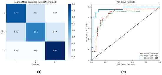 On the withheld test set, the optimized TPOT AutoML model achieved an overall accuracy of 81%. Figure 11 represents the model’s normalized confusion matrix and multiclass ROC-AUC analysis. The confusion matrix demonstrates high true positive rates for the moderate atrophy class (class 2), with most misclassifications concentrated in the mild atrophy group. This behavior suggests that, while the model effectively detects more severe atrophy, it tends to overlap between mild and moderate categories.