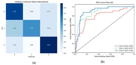 The SVM, configured with an RBF kernel (, ) and tuned through GridSearchCV, was selected for its capacity to model non-linear relationships in medium-sized, high-dimensional datasets. The TPOT framework automated pipeline design and hyperparameter tweaking through the use of evolutionary optimization using 100 people over 15 generations. Using RandomizedSearchCV (15 iterations, 4-fold CV), XGBoost, an ensemble of gradient-boosted trees, was adjusted to enhance multiclass accuracy by modifying important parameters including tree depth, learning rate, and regularization. As a linear benchmark, MLR with L2 regularization was trained via 4-fold CV and adjusted for stability and convergence. The MLP neural network, comprising one hidden layer of 60 neurons with ReLU activation and Adam optimization, was trained for 60 epochs with L2 regularization () to capture complex non-linear interactions. Finally, AdaBoost combined 120 shallow decision trees (max_depth = 2) with a learning rate of 0.8 to assess whether sequential boosting could enhance robustness and discrimination relative to gradient-based ensembles.