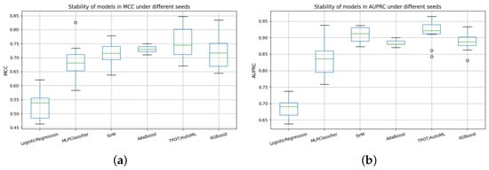 These tendencies were validated by seed-based stability studies (Figure 16). SVM and TPOT/AutoML showed resistance to random initialization with narrow interquartile ranges and high medians in both AUPRC and MCC measures. XGBoost had slightly more dispersion but still maintained competitive values. MLP was sensitive to initiation conditions, as evidenced by its considerable variability despite its high medians. Due to its limited reproducibility, logistic regression displayed the widest dispersion and the lowest medians. The seed-level results shown in Table 11 and Table 12 are in agreement with these patterns.