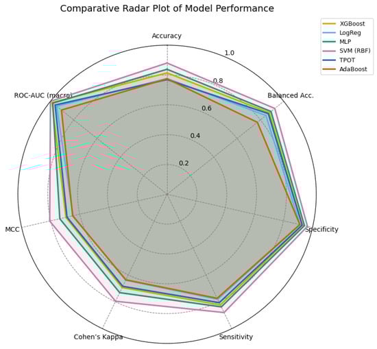 A comprehensive quantitative evaluation was conducted by integrating core and extended performance metrics on the held-out test set (Table 15), together with seed-wise stability analyses using AUPRC and MCC (Figure 16) and per-class operating characteristics (Table 13). Overall, the SVM consistently outperformed the other classifiers, achieving the highest accuracy (0.838), balanced accuracy (0.879), specificity (0.919), and macro/micro ROC–AUC (0.952/0.951), along with top agreement indices (Cohen’s , MCC = 0.768). The MLP and XGBoost models followed closely, with balanced accuracies of 0.848 and 0.835, respectively, and macro ROC–AUC values above 0.93 and 0.94, confirming strong discriminative capability. TPOT/AutoML and Logistic Regression produced competitive but comparatively lower scores, suggesting limited ability to capture non-linear boundaries in this clinical domain, while AdaBoost achieved intermediate performance with high specificity but modest sensitivity.