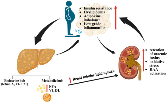 Schematic representation of the hepato–renal metabolic axis in metabolic dysfunction–associated steatotic liver disease (MASLD). Visceral adiposity, insulin resistance, dyslipidemia, adipokine imbalance, and low-grade inflammation establish a bidirectional crosstalk between the liver and kidney. The steatotic liver releases excess lipids and hepatokines that promote renal lipotoxicity, while renal dysfunction amplifies systemic inflammation and dysmetabolism, thereby aggravating hepatic steatosis. Black arrows indicate the direction of the interactions between visceral adiposity, the liver and the kidney within this hepato-renal metabolic axis, whereas red upward arrows denote increased levels of the respective processes or factors. (Created in BioRender. Ghiga, D. (2025) https://BioRender.com/2c9ec31).
