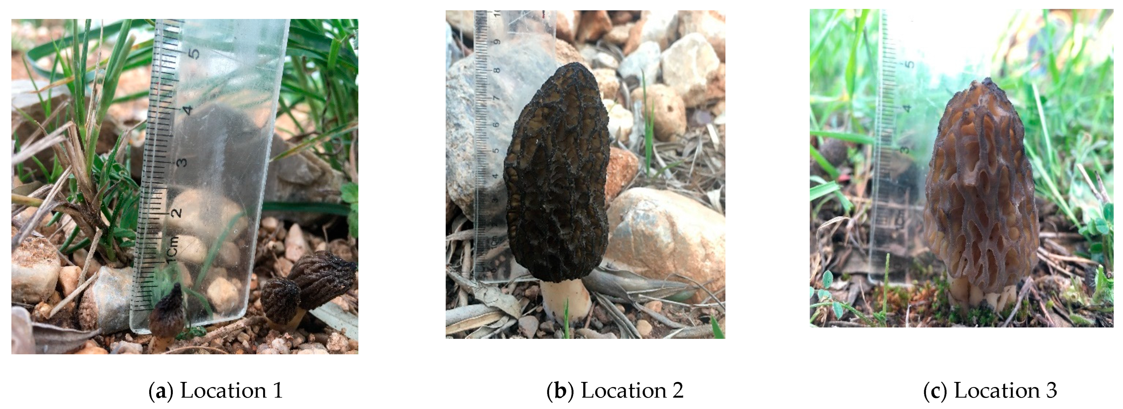 In this study, morel samples were collected from 3 different regions close to each other in Muğla-Ortaköy. These localities are Locality 1: 370 10′ 42″ N, 280 25′ 58″ E, 637 m; Locality 2: 370 10′ 42″ N, 280 26′ 3″ E, 632 m; Locality 3: 370 10′ 43″ N, 280 26′ 5″ E, 637 m. Soil samples are taken at a depth of 20 cm from the localities where morels are collected and analyzed in the accredited Soil, Plant, and Water Analysis Laboratory of Muğla Sıtkı Koçman University (MSKU) Research Laboratories Center. In addition, the length of the samples (cm) is measured and photographed with a ruler at the same time every day for 15 days (Figure 2).
