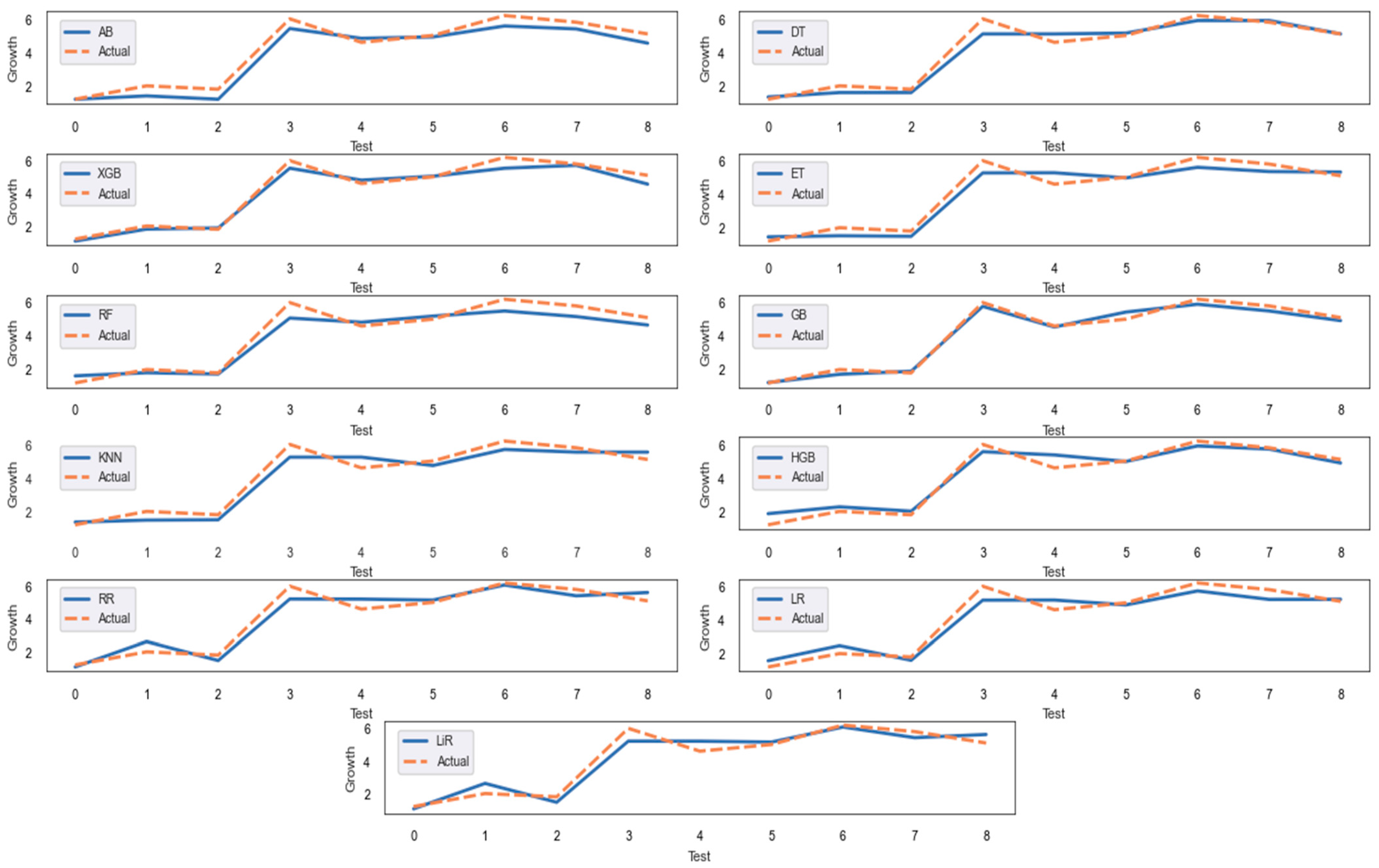 According to Figure 4, GB and XGB produce the prediction values closest to the actual values. Table 3 gives the GoF measures obtained from the eleven models for the test set.