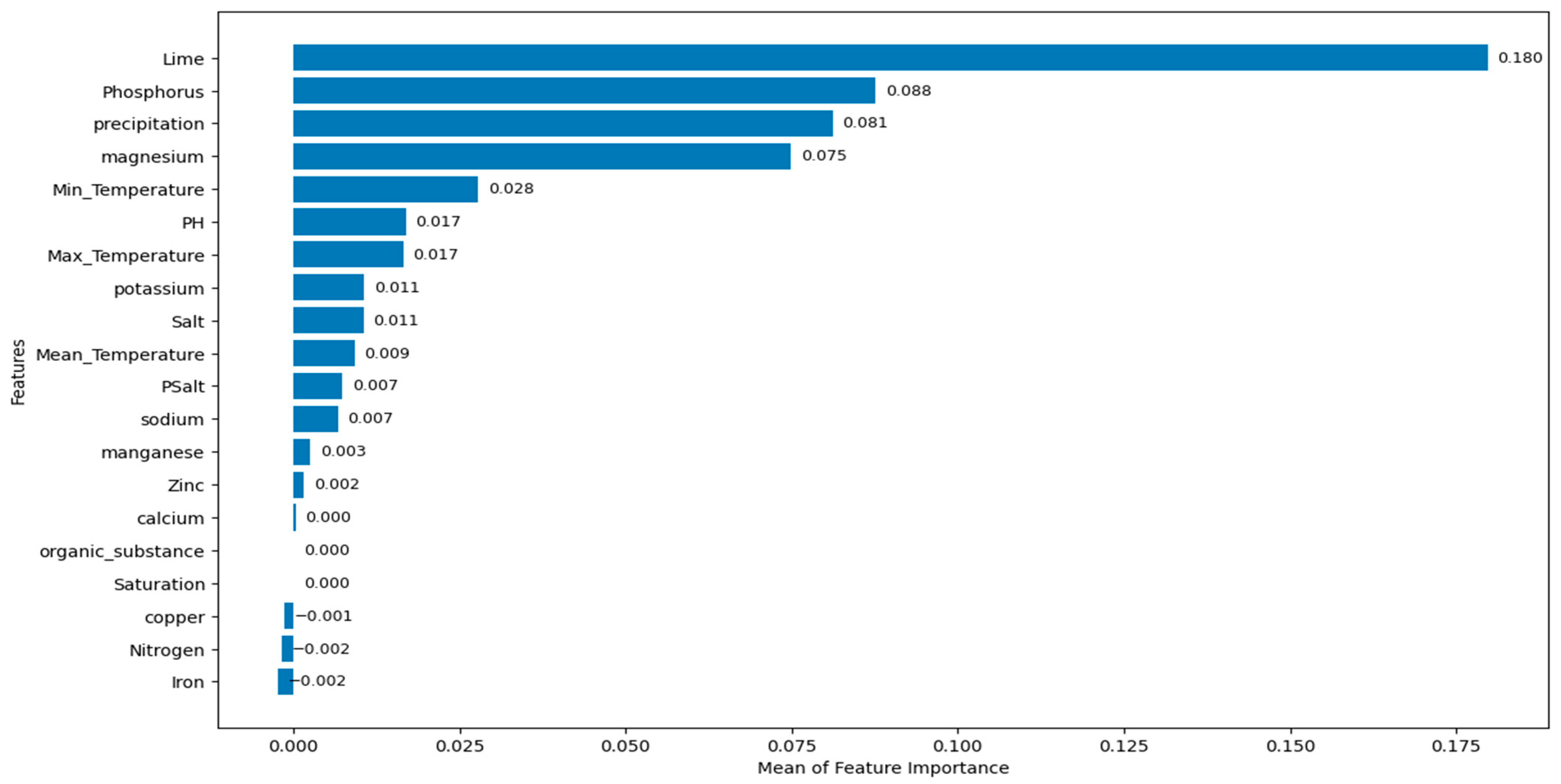 According to Figure 5, the mean of the feature importance scores of lime, phosphorus, precipitation, magnesium, minimum temperature, PH, and maximum temperature are 0.180, 0.088, 0.081, 0.075, 0.028, 0.017, and 0.017, respectively. The most important feature affecting prediction of M. importuna growth is the lime. Then, respectively, phosphorus, precipitation, and magnesium can be considered as effective features on prediction of M. importuna growth. The mean of feature importance of organic substance and saturation are found to be zero. This means that organic substance and saturation do not contribute significantly to the prediction of M. importuna growth. Feature importance means of copper, nitrogen, and iron are negative. These features increase the prediction error.