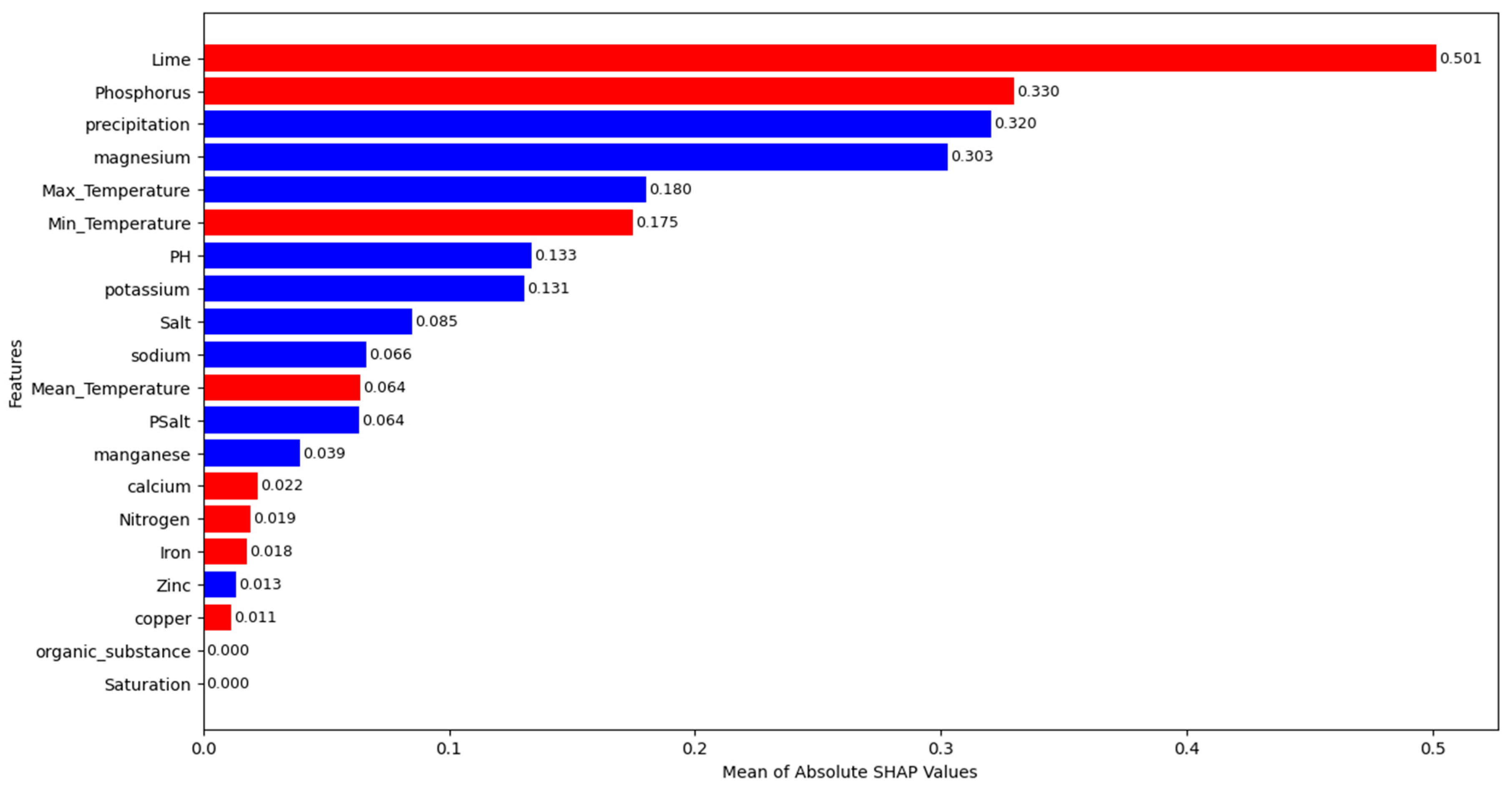 When looking at Figure 6, the highest mean of absolute SHAP value is provided by lime with 0.501. In addition, phosphorus (0.330), precipitation (0.320), and magnesium (0.303) are also found to significantly contribute to the predictions. Saturation (0.00) and organic substance (0.00) are not found to be significant features in terms of their effect on predictions based on mean absolute SHAP values. It is determined that copper (0.011), zinc (0.013), iron (0.018), nitrogen (0.019), calcium (0.022), and manganese (0.039) have small effect on the growth predictions. It is also possible to say from Figure 6 that increases in lime, phosphorus, and minimum temperature decrease the predictions of the growth, while increases in precipitation, magnesium, and maximum temperature increase the predictions of the growth.