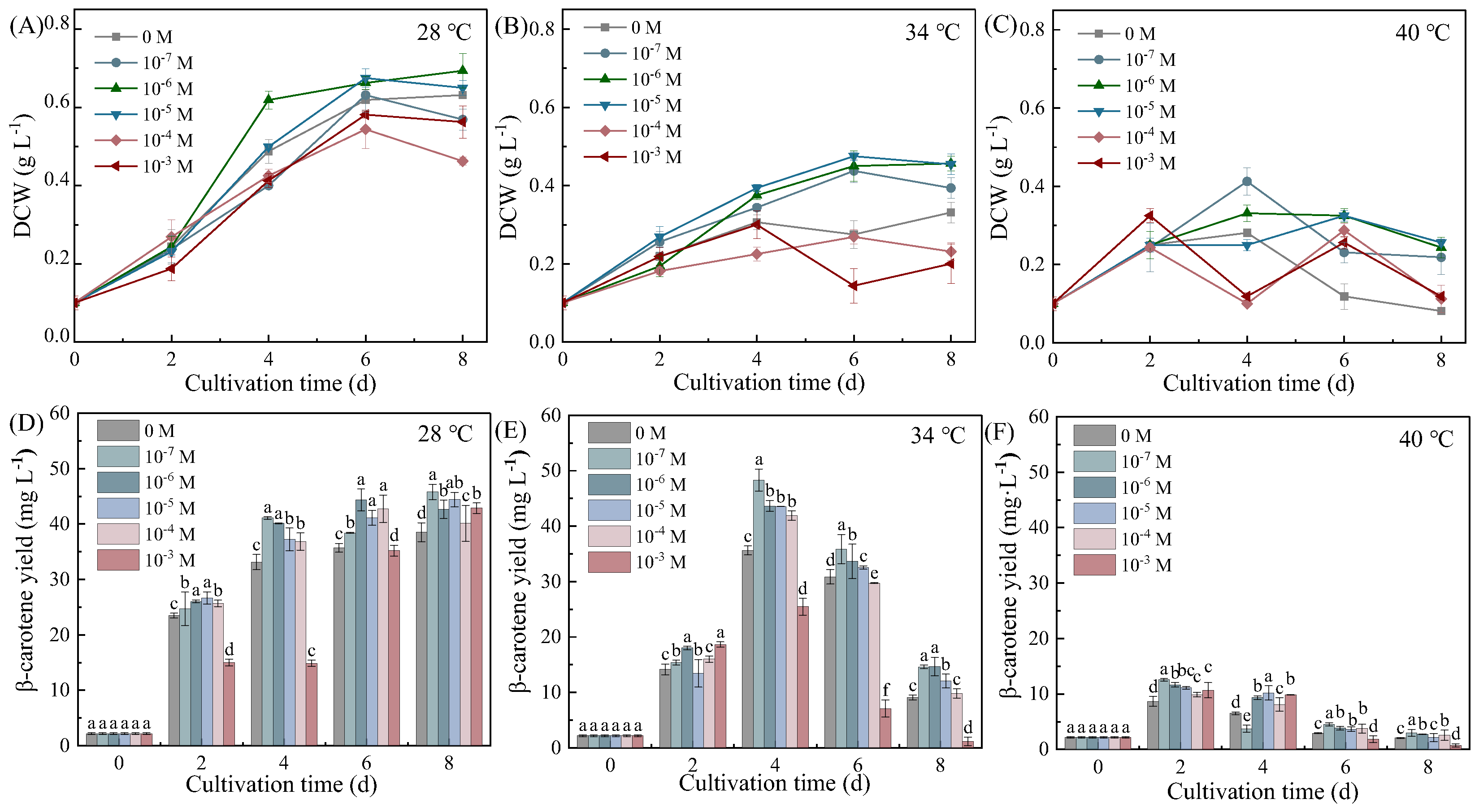 Figure 1. Effects of Put on DCW (AC) and β-carotene yield (DF) in Dunaliella salina under different temperature conditions. (Full statistical results (two-way ANOVA and post-hoc tests) are available in Tables S1–S5. Significant differences among Put concentrations at the same temperature in panels (DF) are directly indicated in the figure. Different letters indicate significant differences (p < 0.05), while identical letters indicate no significant differences (p > 0.05). The same applies to subsequent figures).