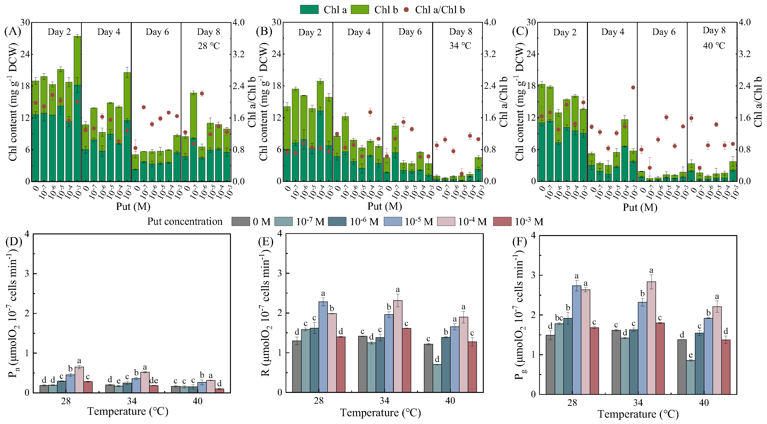 At 34 °C, Put exerted pronounced protective effects on chlorophyll stability. Control cultures experienced a 92.91% decline in total Chl by Day 8, whereas 10−7 M Put treatment increased total Chl content by 43.16%. These structural effects translated into functional improvements, with Pg and Pn at 10−4 M elevated by 75.54% and 160.00%, respectively. In contrast, both low (10−7 M) and high (10−3 M) Put concentrations impaired photosynthetic performance.